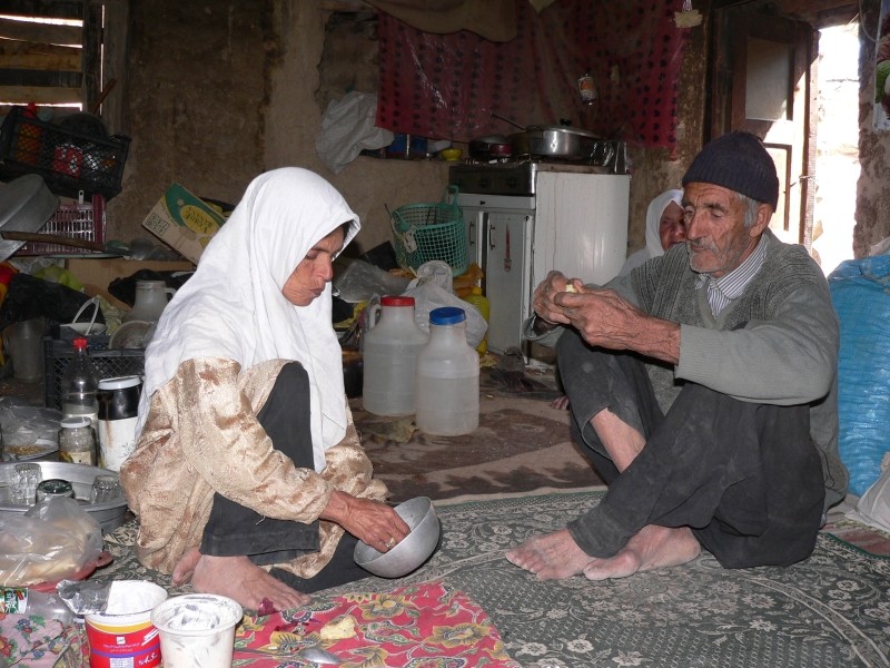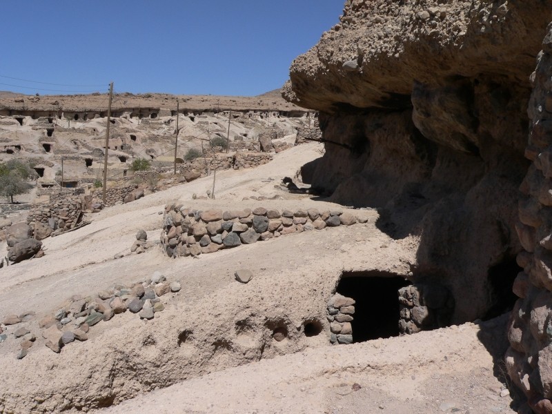 Die Reisegruppe hat sich seit geraumer Zeit ohnehin in zwei Lager gespalten. Das eine „Lager“ besteht aus rd. vier Fahrzeugen und sind lauter notorische Nörgler. Sie haben an allem etwas auszusetzen. Ob das nun ein gekochter Hammel ist, der nicht schmeckt, ob in den Moscheen Kopftücher getragen bzw. die Schuhe ausgezogen werden müssen, ob ein Museeum geschlossen hat, ob an einem Standplatz kein Wasser oder Strom vorhanden ist, ob in einer Stadt kein Internetcafe ist – die Liste könnte unendlich lange fortgesetzt werden. Sie stecken ihre Köpfe zusammen um zu tuscheln und stehen mit ihren Fahrzeugen immer im Verbund und fahren auch oftmals gemeinsam schon früher ab um irgendwo anders zu übernachten. Offensichtlich hat es diese „Viererbande“ (wir nennen sie auch „Extrawürste“) darauf angelegt, einen Teil des Reisepreises zurück erstattet zu bekommen. Das andere „Lager“ – und wir gehören zu diesem – ist zufrieden mit dem Reiseverlauf und dem Service seitens des Veranstalters, ist lustig und freut sich der Dinge, die wir gesehen haben und noch sehen werden. Der Kontakt zwischen beiden „Lagern“ beschränkt sich auf das nötigste. Diese Entscheidung, nach Westen zu fahren, sollten wir nicht bereuen, da unsere Fahrt von Kerman aus nach Maymand ging, das ist ein 3000 Jahre altes Höhendorf mit noch aktiv bewohnten Höhlenwohnungen. Da dieses Dorf auf 2200m ü.d.M. liegt, ist die Temperatur sehr angenehm und die Nächte sind wunderbar kühl. Auch ein kleines Museeum und eine Moschee sind in die Felsen eingebaut. Wir waren dort mittags bei einer Familie eingeladen und tranken Tee, dazu Fladenbrot, Zwiebeln, Pistazien, Joghurt und Frischkäse.
