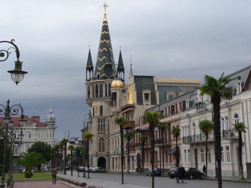 Die Gruppe ist zwischenzeitlich auf 10 Fahrzeuge geschrumpft, aber bei den vorzeitig abreisenden handelte es sich ausschließlich um die bereits erwähnten notorischen Nörgler. Uns war das recht, denn die Stimmung innerhalb der Restgruppe war sofort wesentlich besser. Mit den vorzeitig abreisenden Teilnehmern gab es aber auch noch Schwierigkeiten: einige hatten es nicht für notwendig gehalten, sich zu verabschieden, andere reisten sogar ab ohne die Endabrechnung mit dem Reiseleiter zu machen und blieben so ein paar hundert Euro „schuldig“. So ein mieses Verhalten hätte ich mir nicht träumen lassen. Batumi ist eine sehr schöne, moderne Stadt mit ausgefallenen architektonischen Gebäuden, aber auch die alten Gebäude wurden/werden liebevoll restauriert. Das örtliche Fernsehen schickte Reporter um eine Reportage über uns und unsere Reise zu machen. Am Abend war dann das Abschiedsessen in einem urigen Lokal, ganz typisch georgisch. Vorspeisen, Hauptgerichte, Nachspeise und Getränke so viel und was man wollte. Der Tisch bog sich unter der Last der Speisen! Es wurde viel geredet und gelacht und es war ein recht schöner Abend. Batumi: