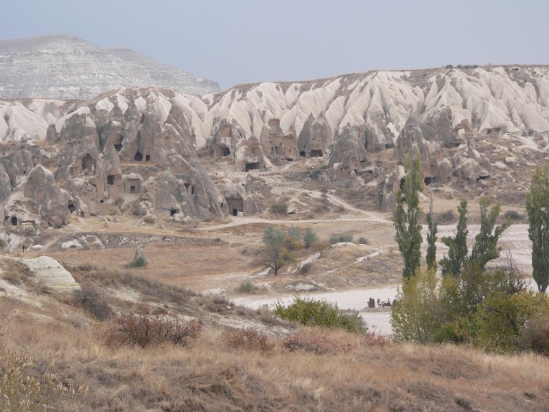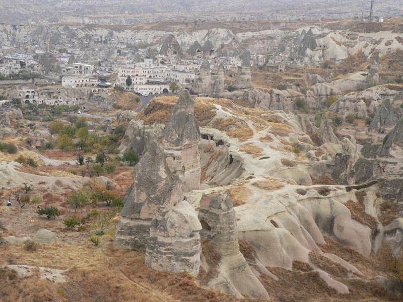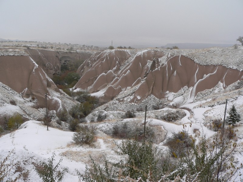 Am nächsten Tag war dann das letzte Meeting und seit dieser Zeit sind wir ohne Gruppe und Gruppenzwang „selbständig“ unterwegs. Nochmals Wasser auftanken und entsorgen und dann ging es Richtung türkischer Grenze (problemos zu passieren, lediglich ein paar Stempel in den Pass) am Schwarzen Meer entlang bis Macka. Hier gab es bei einem Fischrestaurant Stellplätze mit Strom und Duschgelegenheit. Auf dem Weg nach Göreme zu den allseits bekannten Felswohnungen sind wir bis kurz vor Tokat gefahren und standen an einer Tankstelle (der Liter Diesel kostet jetzt 1,58ct/Liter – ein ungewohnt stolzer Preis, denn im Iran waren es 9ct). Hier konnte ich das Gogolobil nach langer Zeit auch mal wieder waschen lassen. Zunächst aber ging es noch einige Zeit an der Südküste des Schwarzen Meeres entlang, dann führte die Straße über die Berge. Stellenweise waren die Wolken sehr tief und wir fuhren im Wolkennebel. Aber die Laubfärbung war wieder sehr schön und abwechslungsreich. Es wurde spürbar kälter und auf dem Weg nach Göreme zeigte das Thermometer nur noch 5° (in den Bergen war die Temperatur schon unter o°), die Berge ringsum waren „angezuckert“. Auf einer Abkürzungsstraße wurde das Gogolobil wieder sehr schmutzig (die Wäsche am Vortag hätte ich mir sparen können), denn wir mussten einige Kilometer im aufgeweichten Baaatz fahren. Seit unserem letzten Besuch in Göreme vor 30 Jahren hat sich viel geändert und es ist auch viel gebaut worden in der Gegend. Trotzdem ist die Landschaft unverändert beeindruckend. In der Nacht hat es dann ringsum geschneit und die Felsen von Göreme waren mit Schnee überzogen. Die Schneefallgrenze war unmittelbar bei Göreme – ein wenig unterhalb war von Schnee nichts zu sehen. Eine kleine Rundfahrt zeigte uns die Landschaft mit den teilverschneiten Bergen – zum spazieren gehen war es einfach zu kalt und ungemütlich. Insbesonders wenn mann/frau aus warmen Regionen kommt und die Kälte noch nicht so gewohnt ist. Das Gogolobil erreichte an diesem Tag den Kilometerstand von 70.000! In Göreme hatten wir uns auf dem dortigen Campingplatz einquartiert und auch dort recht gut gegessen. Wir kauften auch eine Granatapfel-Sauce, die man für Salat verwenden kann. Türkische Schwarzmeerküste: