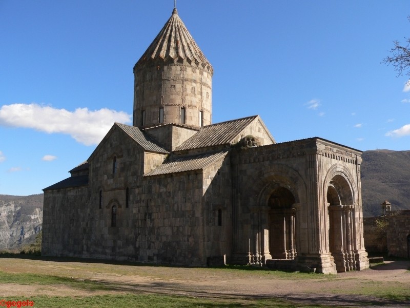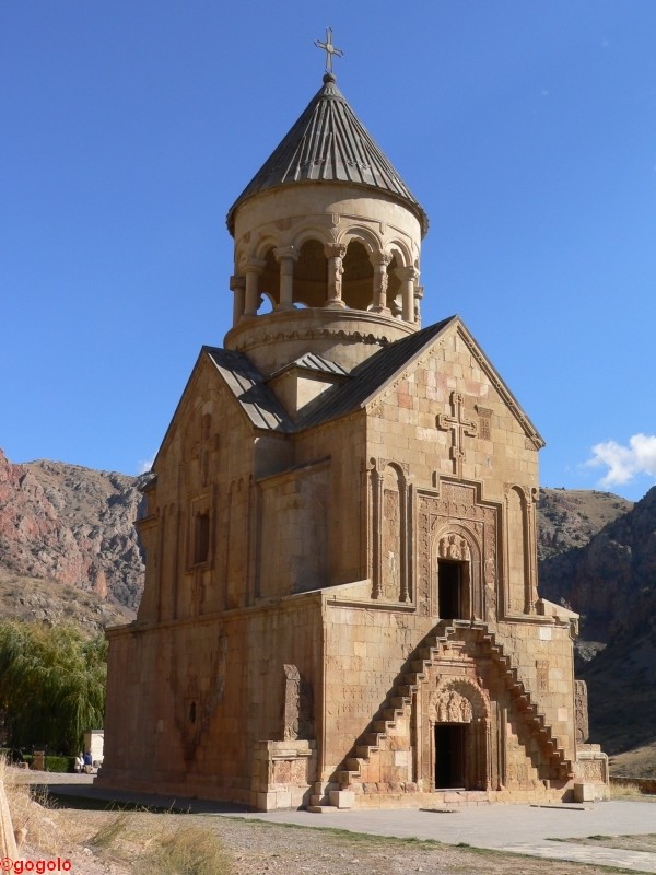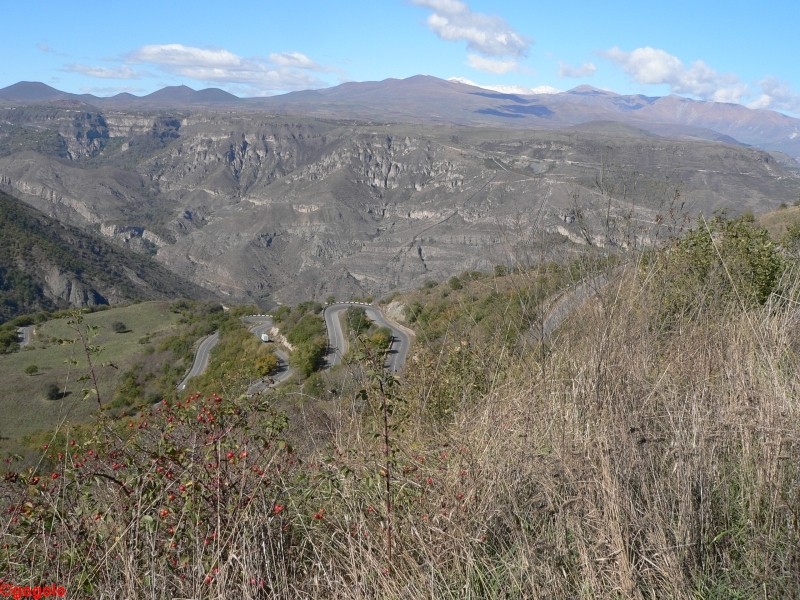 In Armenien ging es dann immer hart an der Grenze zu Aserbaidschan entlang bis zum Bergkloster in Tatev. Dieses ehemalige Kloster liegt sehr hoch und abgelegen in den Bergen und es führt die letzten 8 km nur eine Schotterstraße mit scharfen Kehren und über 12% Steigung hinauf (ich denke, es waren aber so ca. 20%, denn das Gogolobil brauchte dazu den 2-3 Gang). Wir parkten unmittelbar neben den alten und gut erhaltenen Klosteranlagen. Unser armenischer Führer erklärte uns eindrucksvoll die Historie des Klosters und hat auch in der Kirche mit seiner geschulten, kräftigen Stimme (er ist im Zweitberuf auch Opernsänger) ein stimmungsvolles Kirchenlied gesungen. Hier oben auf über 1800m war es dann nachts bei einem wunderbar klaren Sternenhimmel ganz schön frostig und die Heizung musste erstmals angemacht werden.