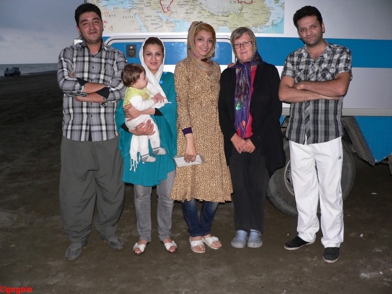 Hashtpar, ebenfalls an der Küste des Kaspischen Meeres war dann die nächste Station. Wir standen mit dem Gogolobil direkt am Strand und konnten uns am Meeresrauschen erfreuen. Natürlich waren wieder viele Iraner am Fahrzeug um unsere Reiseroute auf der Karte nachzuvollziehen. Darunter war auch eine ganz nette iranische Familie, die uns dann spontan zum Abendessen eingeladen hat. Sie wohnten in einem Zelt gleich in der Nähe und es gab Fladenbrot mit iranischem Omlette, das sind kleingeschnittene, gebratene Tomaten mit Rühreiern und Knoblauch gemischt (ganz hervorragend!) und das ganze wird mit dem Fladenbrot gegessen. Ferner Oliven, Fetakäse mit geriebenen Pistazien und Obst sowie den obligatorischen Tee. Für uns Männer wurde noch eine Wasserpfeife angezündet. Das Ganze spielte ich auf dem Boden des Zeltes und später dann auf dem Zeltvorplatz ab. Uns überwältigte die iranische Gastfreundschaft, das sind wir so nicht gewohnt. Natürlich brachten wir auch ein Gastgeschenk in Form von Süssigkeiten aus Yazd mit.