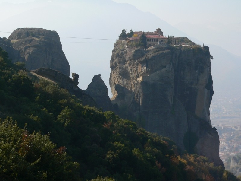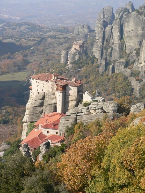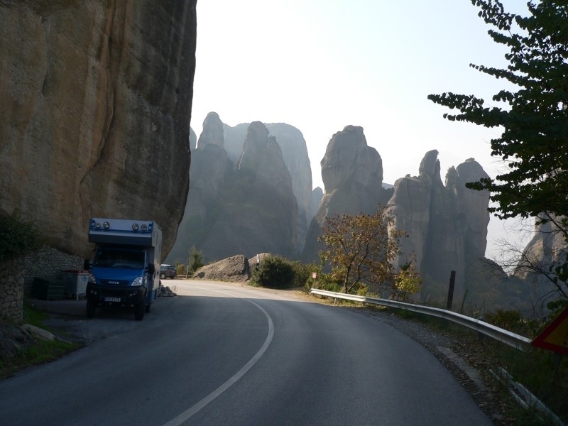 Wir beschlossen, dass wir nun auf dieser Reise keine Ausgrabungen mehr ansehen werden. Deshalb fuhren wir gleich nach Canakkale um dort mit der Fähre über die Dardanellen überzusetzen und so Istanbul auszulassen. Der Grenzübergang von der Türkei nach Griechenland war „kurz und schmerzlos“ – nicht einmal die Pässe wurden angesehen. In Alexandroupolis verbrachten wir die Nacht an einem Campingplatz direkt am Meer. Erstmals hörten wir wieder vertrautes Glockengeläut anstelle des Muezzins, der uns in den islamischen Ländern oftmals schon um 5 Uhr früh mit seinem Gesang geweckt hat. Wir wollten noch zu den Meteora-Klöstern fahren. Aber nicht in einer Etappe, sondern ganz piano und ohne Hetze. Darum machten wir einen Zwischenstopp in Veroia und haben nach längerer Suche und umherfahrerei einen tollen Übernachtungsplatz hoch über dem Ort bei einem Fußballplatz gefunden. Hier hatten wir eine schöne Aussicht auf das Tal und es war hier oben nicht nur sehr sicher sonderen auch sehr ruhig. Allerdings ist es mittlerweile auch schon ziemlich kalt geworden, morgens war der Boden gefroren und auch tagsüber hat es selbst bei Sonnenschein nur so um die 10° „Wärme“. Wir waren halt verwöhnt von den Temperaturen auf der Seidenstraße, wenngleich es dort durchaus mal sehr heiß war. Aber die Heizung im Gogolobil funktioniert hervorragend und wir mussten nicht frieren. Schon gegen die Mittagszeit erreichten wir Meteora und machten gleich eine Rundfahrt mit dem Gogolobil zu den Klöstern bei strahlendem Sonnenschein. Der blaue Himmel, das bunte Herbstlaub und die atemberaubende Umgebung haben uns zu vielen Fotostopps anhalten lassen. Am Abend gab es griechische Spezialitäten in einer kleinen Taverne, dazu Rezina und Ouzo.