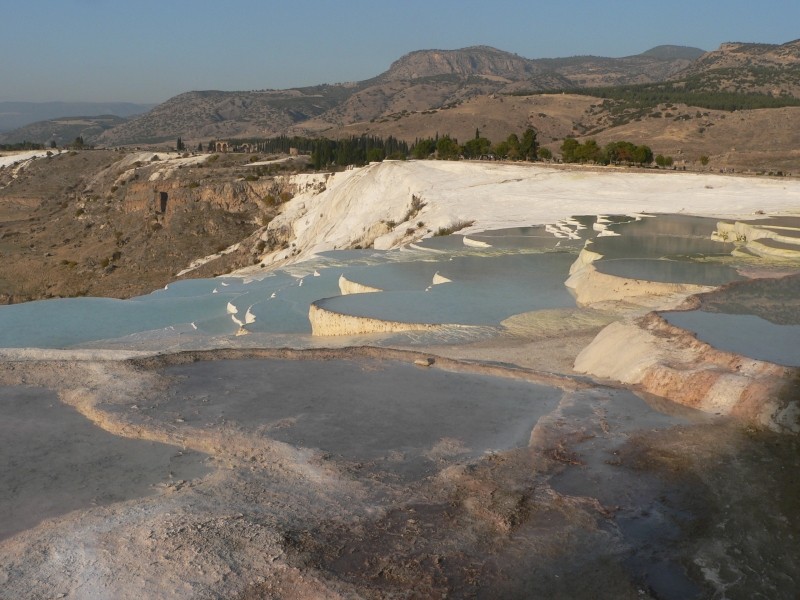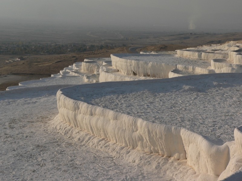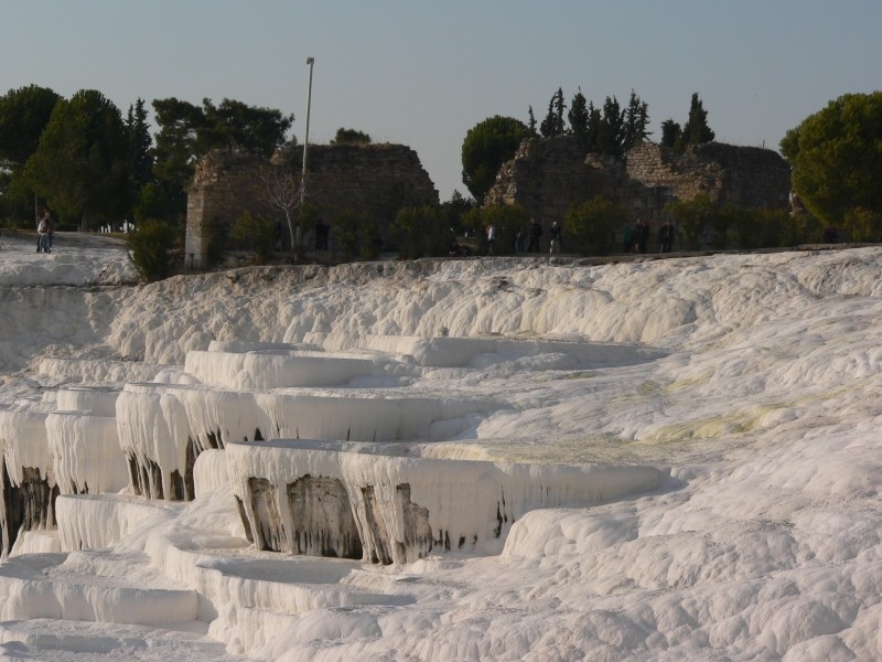 Auch die zwanglosen Erholungstagen in Manavgat/Türkei gingen irgendwann einmal zu Ende, da war auch Anfang Dezember wieder zuhause in Rosenheim sein wollten. Außerdem fing es in Manavgat zu regnen an und es wurdeauch dort kühl. So brachen wir dann auf um uns noch etwas von der Türkei anzusehen und wir fuhren ins Landesinnere nach Pamukkale zu den berühmten weißen Kalksinterterrassen. Seit unserem letzten Türkeibesuch vor rund dreißig Jahren hat sich auch hier einiges grundlegend geändert. Nicht alles zum Vorteil, denn so konnten wir nicht mehr in dem warmen Wasser der Terrassen banden, alles ist reglementiert und selbst der Aufgang zu den Kalkfelsen muss barfuss!!! Erfolgen. Gottseidank ist wenigstens das Wasser lauwarm. Auch 20 TL Eintritt (rd. 10€) muss man dafür bezahlen. Trotzdem sind die schneeweißen Kalkterrassen im Abendlicht (wir hatten wieder besseres Wetter) sehr schön anzusehen wenngleich nur noch ein paar wenige Terrassen mit Wasser gefüllt sind.