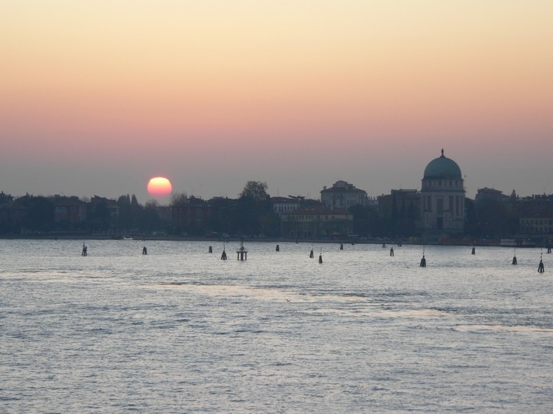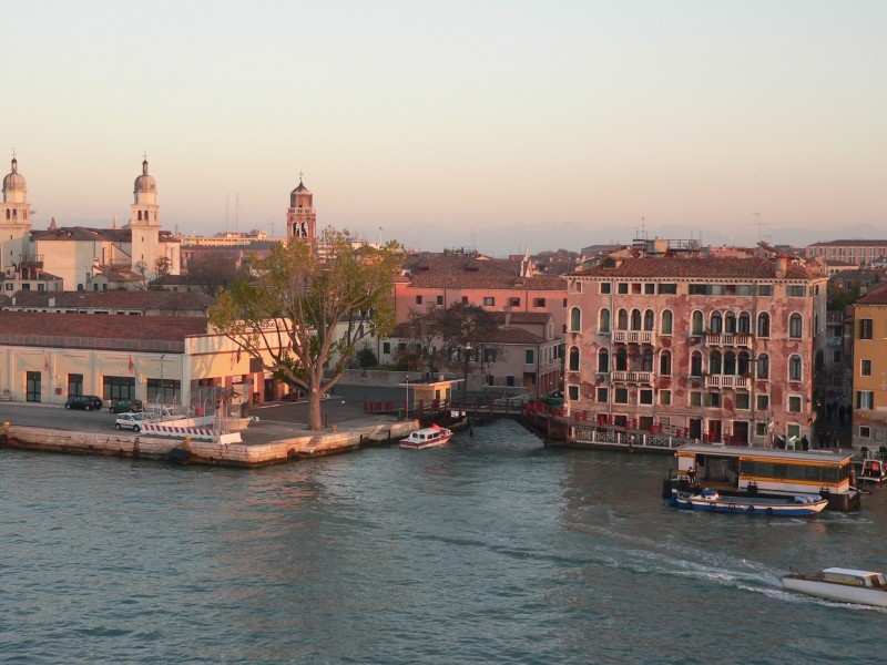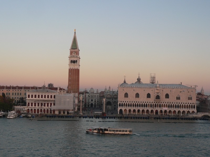 Im Ort sahen wir einen LIDL-Markt und konnten dort erstmals wieder bekannte und heimische Produkte erwerben. Auch dunkles Brot gab es dort – welche Freude! Das Wetter wird schon wieder bedeckt und auf der Weiterfahrt nach Igoumenitsa fängt es sogar zu regnet an. In der Hafenstadt haben wir bei der erstbesten Agentur gleich eine Schiffspassage nach Venedig gebucht. Und wir hatten in zweierlei Hinsicht Glück, denn erstens war in der nächsten Fähre der Minoan-Lines ((Europa Palace), die zwei Tage später losfuhr, Plätze frei und zweitens hat die Fähragentin für uns Geld gespart. Denn neben dem Preis für das Fahrzeug hat sie nur für eine Person (Gogoline) eine Kabine gebucht (in die sonst keine fremde Person reinkommt) und für die zweite Person (Gogolo) nur eine normale Passage. Ich konnte dann aber das in der Kabine vorhandene zweite Bett ohne weiters nutzen und habe dadurch über 120 € gespart. Das war richtig nett von der Fähragentin! Die 23-stündige Überfahrt nach Venedig war unspektakulär – wie halt Fährpassagen so sind. Lediglich bei der frühmorgendlichen Einfahrt nach Venedig ging gerade die Sonne auf und das Schiff fuhr in die Lagune von Venedig nur rund 100m am Anleger des Dogenpalastes und des Campanile vorbei. Sehr beeindruckend.
