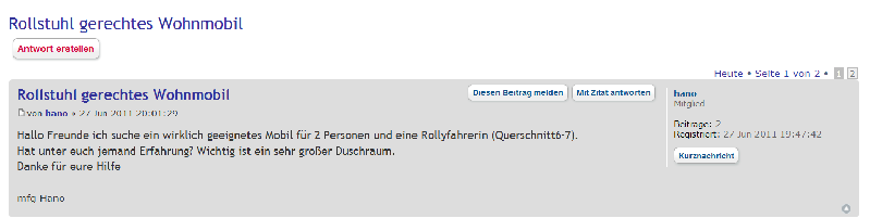 Herzlich willkommen im Forum. Wir hatten vor 6 Jahren dasselbe Problem. Nachdem wir bei der Firma Hehn und auf der Reha-Messe waren, haben wir uns aus Kostengründen, für einen Selbstausbau entschieden und sind mit unserem Kastenwagen sehr zufrieden. LG fiat08 :) Hallo Hano, ich verkaufe im Auftrag ein sehr gut erhaltenes genau 10 Jahre altes Wohnmobil von Hehn. Es ist Rollstuhlgerecht und hat nur 11986km. Wenn du grundlegend Interesse an diesen Mobil hast, würde ich mich freuen von dir zu lesen/hören. Ich habe es auch in die Anzeigen gestellt, kann die leider nicht genau sagen ab wann es sichtbar wird. Liebe Fabian Ich bin mir nicht sicher, ober der TE überhaupt noch hier reinschaut, bestimmt ist er auch schon fündig geworden, denn der Tread wurde im Juni 2011 gestartet ![]() Danke fürs Wecken! :D Gerne doch! ;D ooops :D :D hatte auch die Augen fest geschlossen.... Hallo an alle, ich habe auch noch eins zu verkaufen. Keiner interesse?? MfG Rolli2001 Hallo rolli2001, steht das Angebot noch? Da meine Frau mit MS im Rollstuhl sitzt und er Wohnwagen bald nicht mehr nutzbar sein wird, ist ein rolli-geeignetes WoMo wohl die nächste Alternative. , Jürgen |