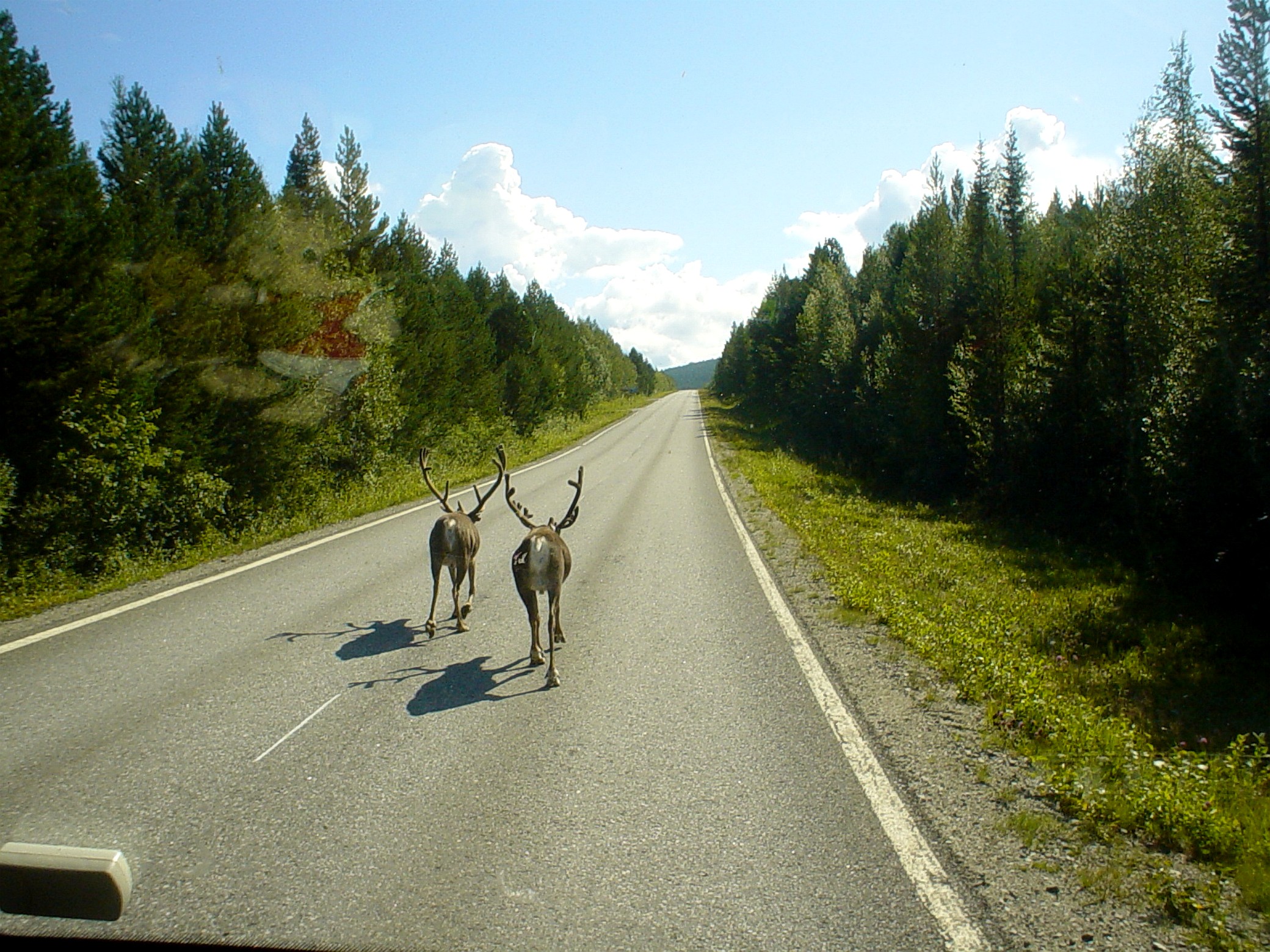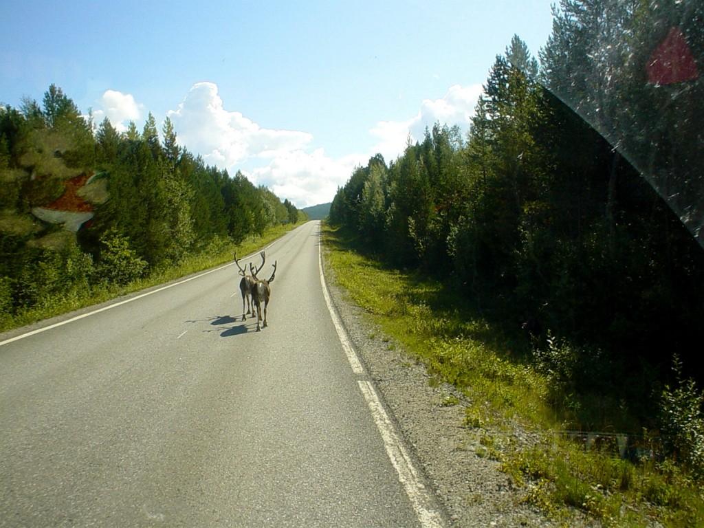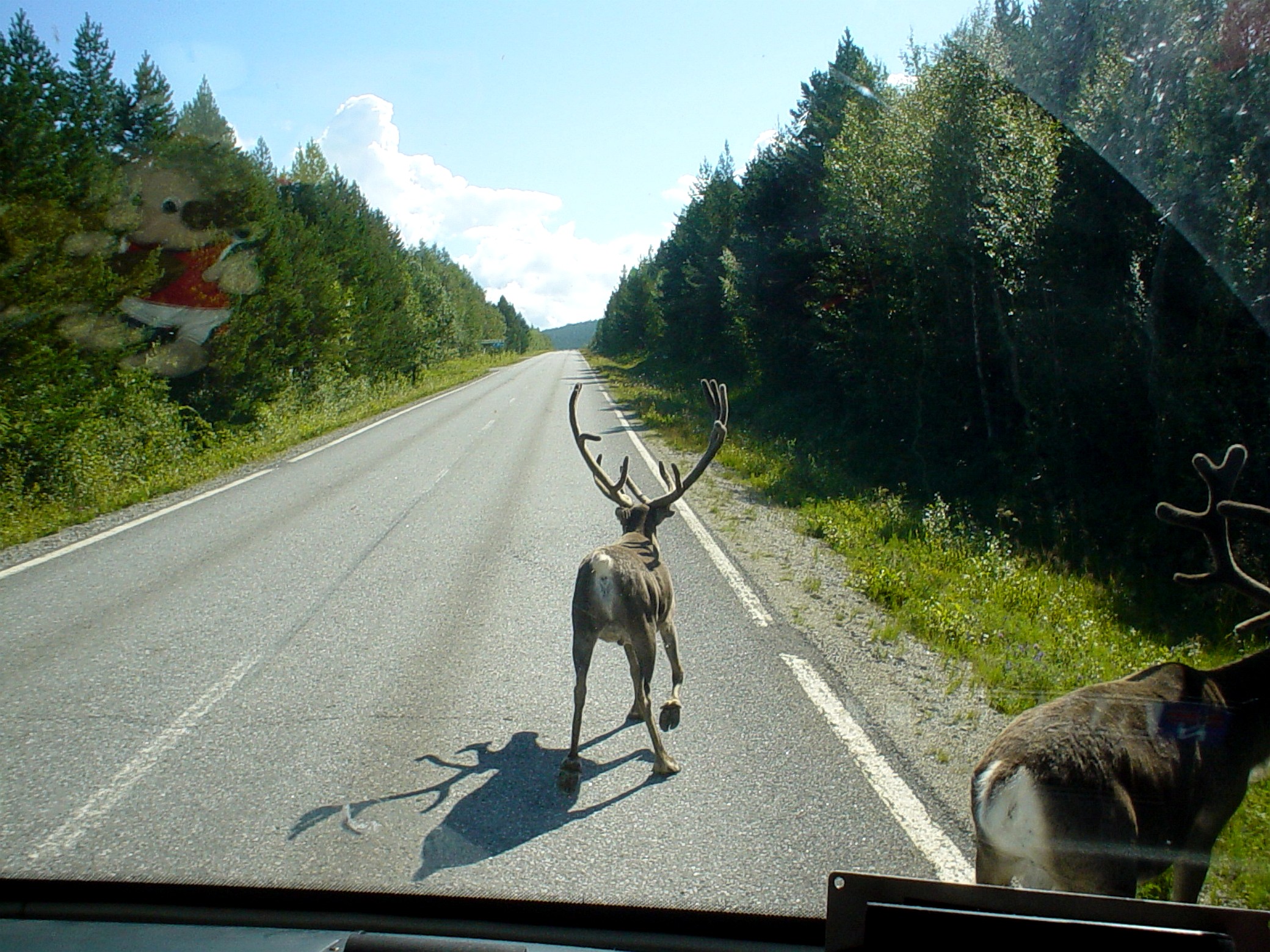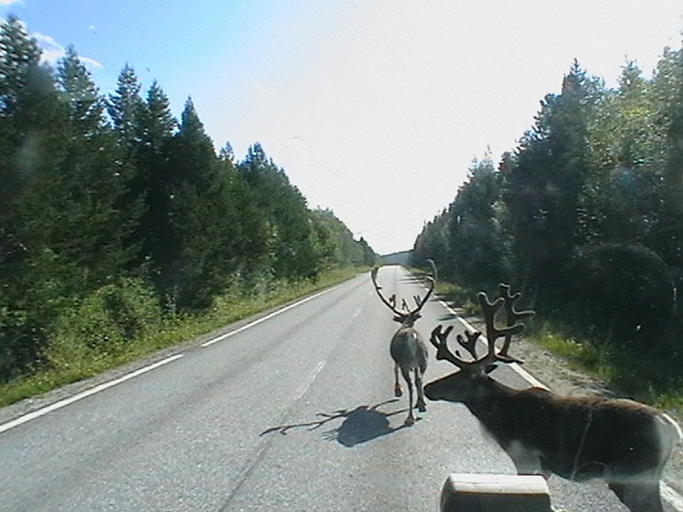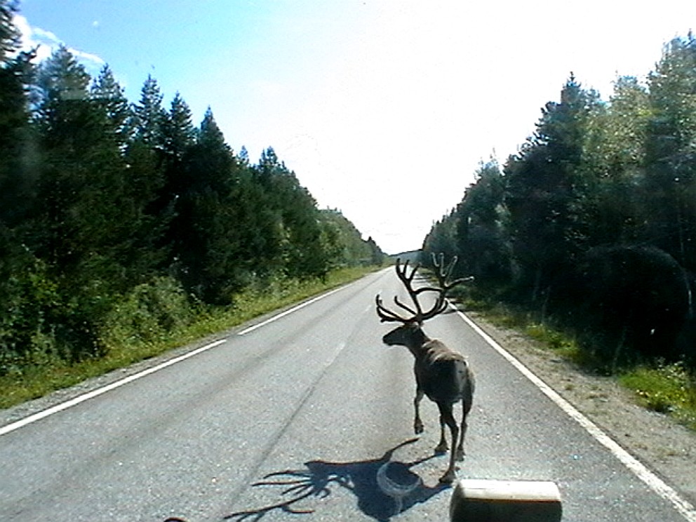 und hier schon in Schweden - erkennbar am wechsel vom gelben zum weissen mittelstrich auf der fahrbahn. Schon nach einigen kilometern begegnen wir den ersten skandinavischen ureinwohnern, welche unbeeindruckt von uns mitten auf der strasse dahin