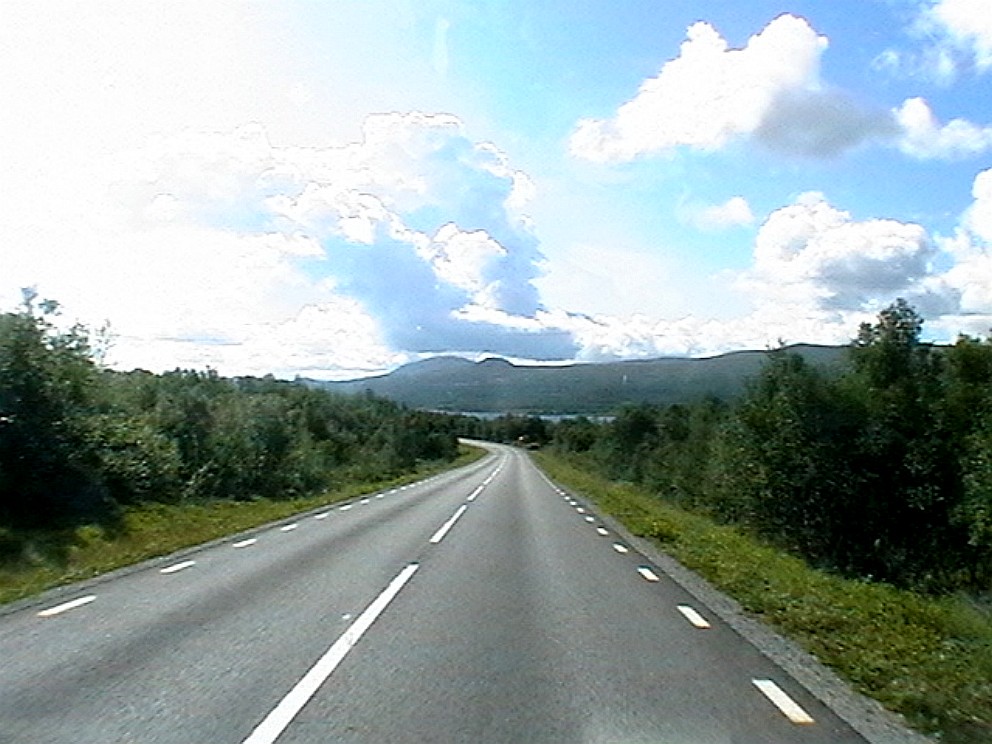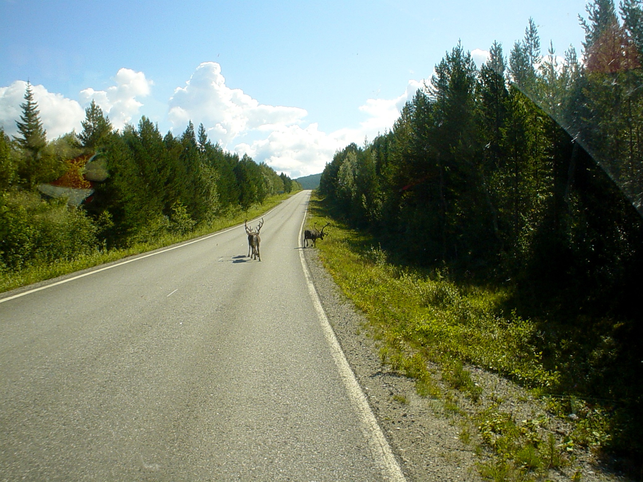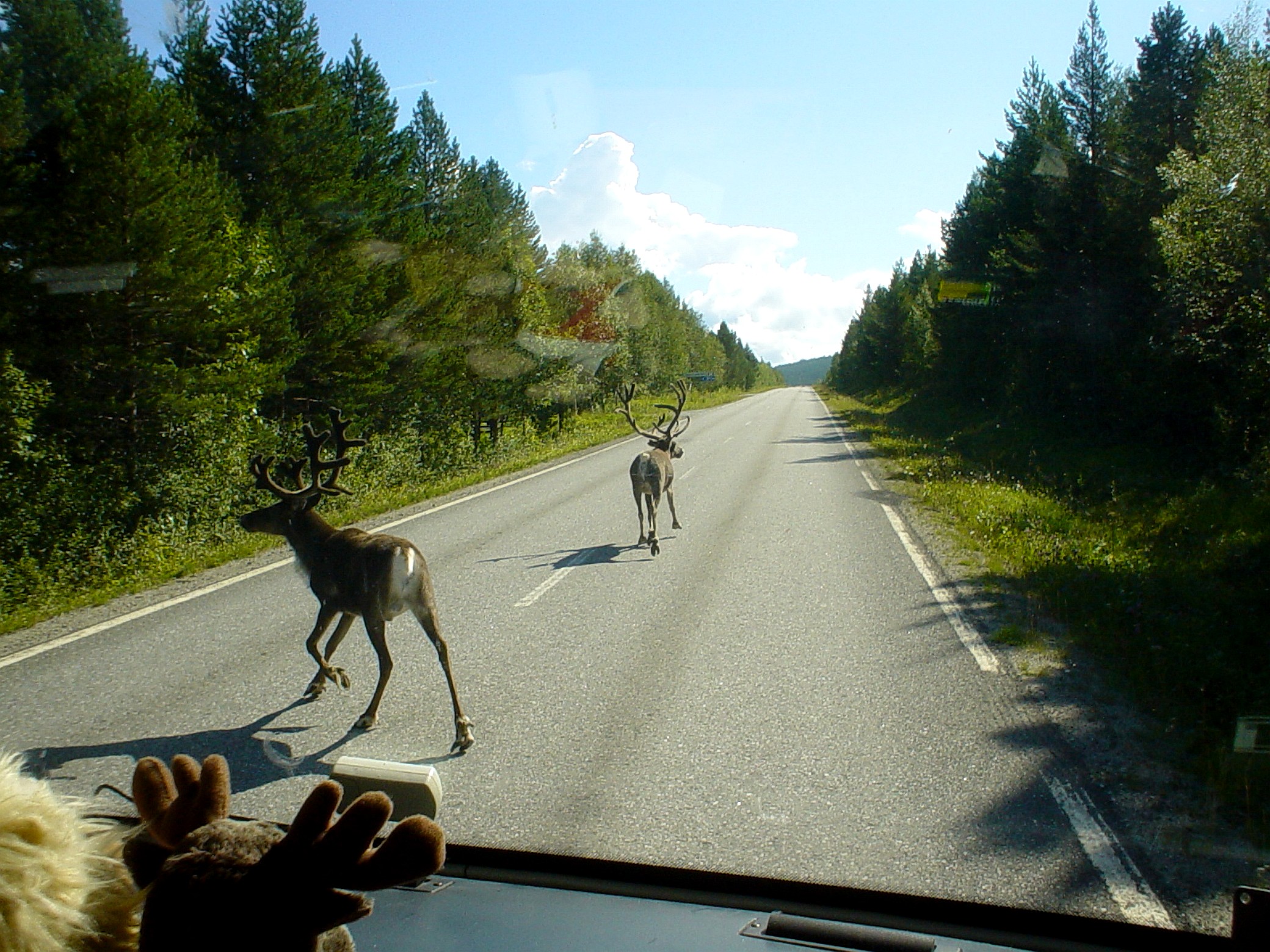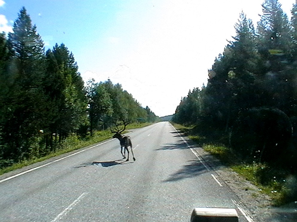 und hier schon in Schweden - erkennbar am wechsel vom gelben zum weissen mittelstrich auf der fahrbahn. Schon nach einigen kilometern begegnen wir den ersten skandinavischen ureinwohnern, welche unbeeindruckt von uns mitten auf der strasse dahin