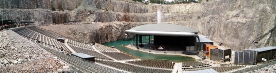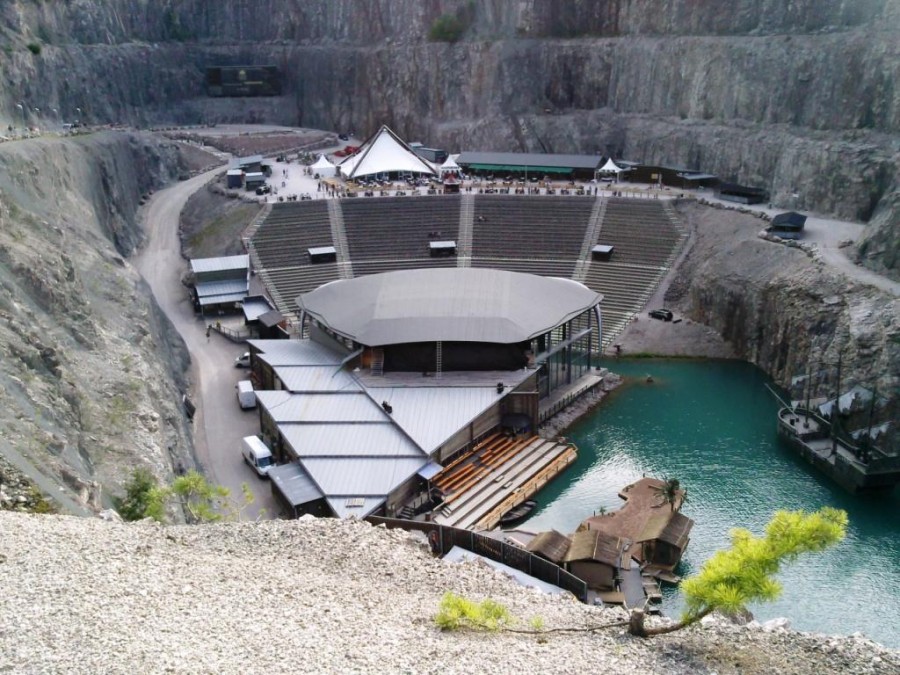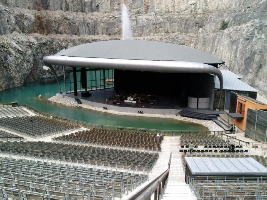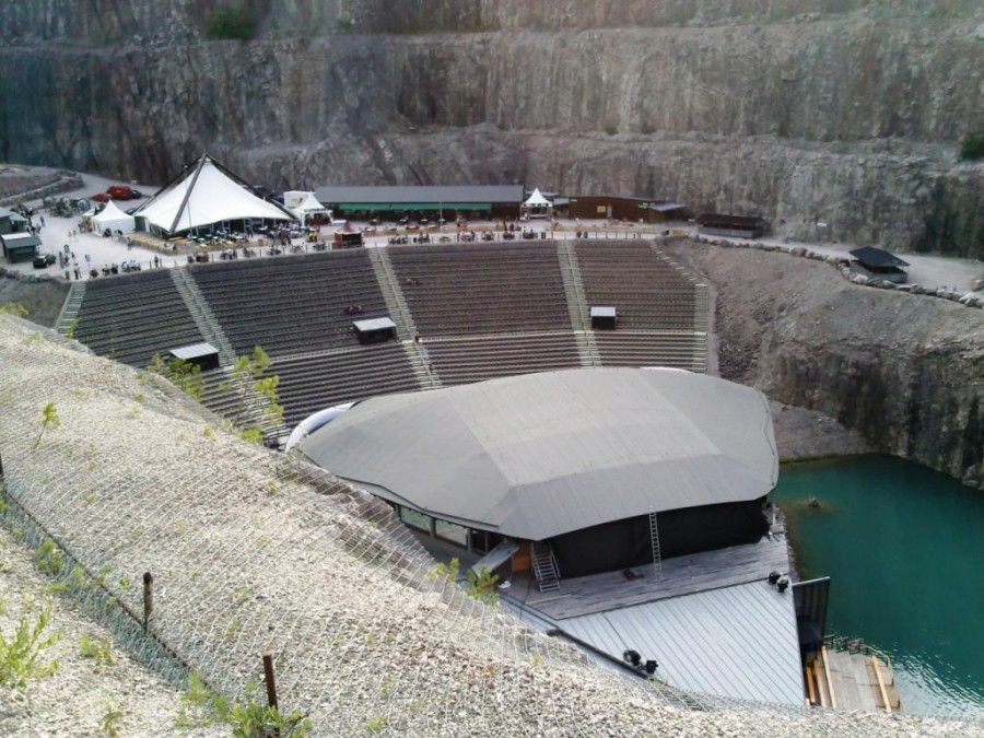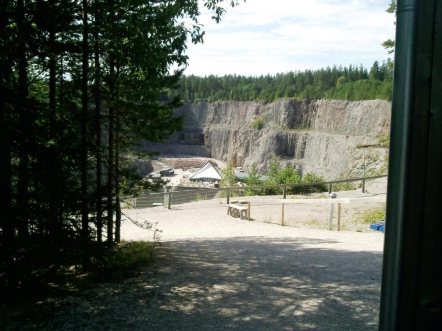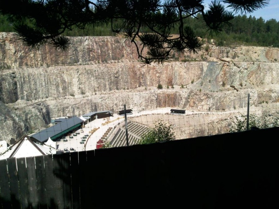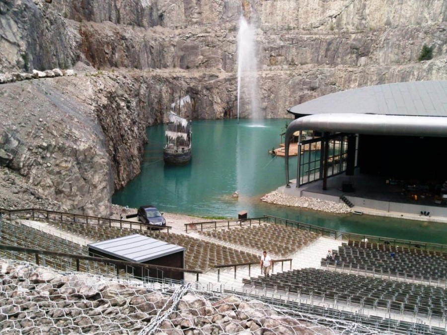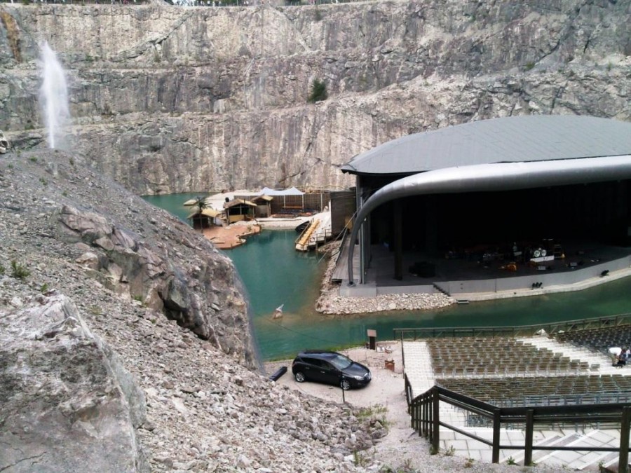 Zuerst wollten wir uns mal den steinbruch mit der freilichtbühne anschauen,aber da hätten wir für nachmittags noch extra eintrittsgeld bezahlen sollen und ab 18.00 uhr war sowieso einlassbeginn für die abendveranstaltung. Also fuhren wir erst mal außen rum wo die steinbruchkante durch einen hohen bretterzaun vor dem betreten gesichert ist und an diesem zaun ging ein mehr oder weniger guter rad-,reit- und wanderweg entlang,aber an einigen stellen hatte man die möglchkeit auf großen steinblöcken stehend mal dei ersten blicke über den zaun zu machen - natürlich auch mit foto.