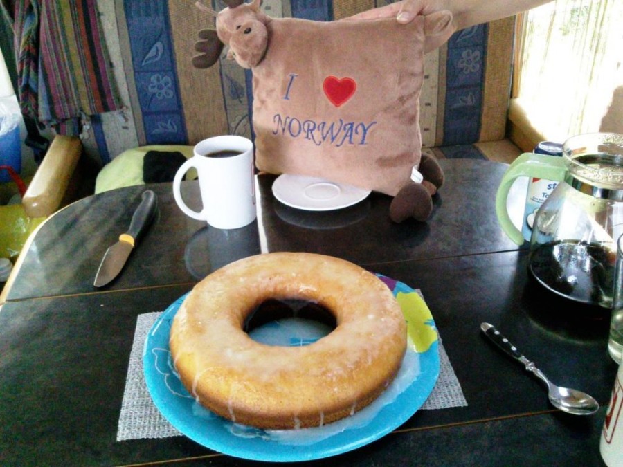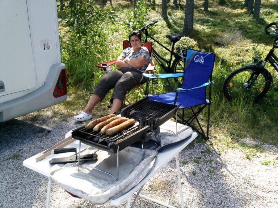 Wir waren an diesem tag die einzigen griller und besonders die nachbarshunde hielten alle ihre nasen in richtung grill. Am spätnachmittag war dann für uns noch eine premiere - der erste im womo gebackene kuchen(noch am vormittag am letzten übernachtungsplatz in Furudal gebacken) mit dem Omnia-backofen wurde angeschnitten.