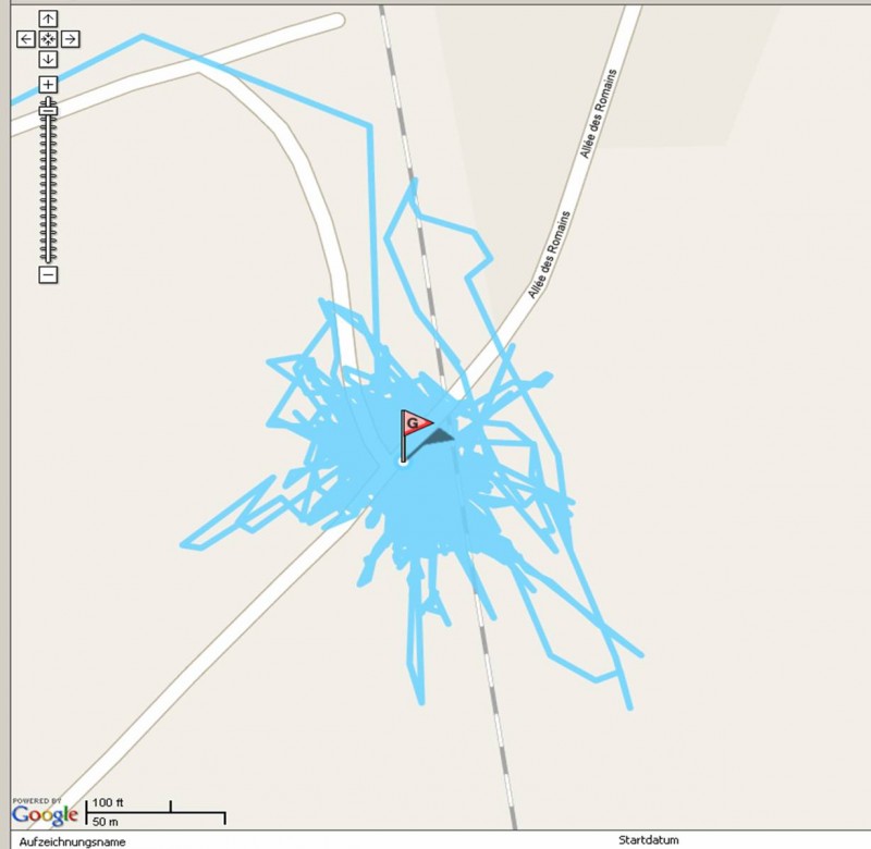 Logisch wäre jetzt, dass der Tracker ziemlich genau in der Mitte des gezeichneten Bereiches lag!? Ein Womo, ein Fahrrad oder Moped, was man mit dem Tracker ausgestattet hätte, wäre wohl recht schnell gefunden worden. Der kleine Tracker solo natürlich nicht.