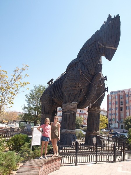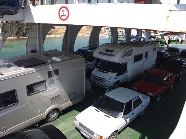 Der heutige Sonntag ist mal wieder ein Reisetag. Nach dem Frühstück wird gepackt und das Womo reisefertig gemacht. Gegen Mittag kommen wir los und fahren nach Kilitbahir, um dort mit der Fähre die Dardanellen zu überqueren. Auf dem Weg dorthin fahren die Küste entlang und entdecken hierbei einige schöne Stellplätze direkt an den Dardanellen, von denen man sehr schön die vorbeiziehenden Schiffe beobachten kann. In Kilitbahir löhnen wir 30 TL für die Fähre und bereits nach wenigen Minuten Überfahrt erreichen wir Cannakale auf der asiatischen Seite der Türkei. Hier schauen wir uns erst mal das „Trojanische Pferd“ aus dem Film „Troja“ mit Brat Pitt an. Nach kurzen Foto- und Essensstopp geht’s weiter Richtung Izmir. Kurz nach dem Ortsende geht’s erst mal Tanken und in den Kipa-Supermarkt, um die Vorräte wieder zu füllen. Wir entschließen uns, nach Assos zu fahren, um dort an der im Schulz beschriebenen Kardiga-Bucht zu baden und zu nächtigen. Dort nach interessanter Fahrt durch die Berge mit teilweise heftigem Straßenverlauf angekommen, entdecken wir einen schönen Platz am Strand, den wir befahren wollen. Hans-Peter kommt mit seinem Hymer gerade noch so durch eine Bodenwelle, ich versuche daher langsam durchzukommen, ohne aufzusetzen. Dies war allerdings ein Fehler, da ich steckenbleibe und beim Versuch mit freizufahren genau das Gegenteil geschieht. Aber bereits nach wenigen Minuten kommt ein türkischer Rollerfahrer vorbei und erkundigt sich, ob wir einen Traktor brauchen. Wir bejahen dies und kurz darauf kommt er auch schon vorbei und zieht uns aus dem Schlammassel. Wir bedanken uns mit 20 TL fahren auf einen Parkplatz hinter einer Strandbar, in der wir dann anschließend gut essen und von den Inhaber abends noch auf einen Raki eingeladen werden. Auch hier ist die Gastfreundschaft wieder sehr groß, was wir so nicht gewöhnt sind.