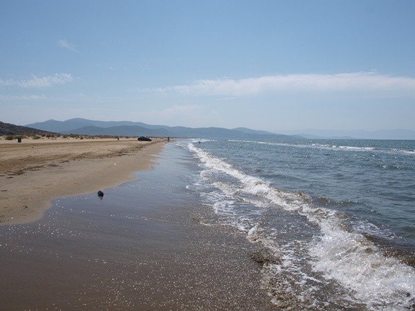 Nach einer kurzen Nacht (geplante Ankunft in Igoumenitsa um 5.30 Uhr) stehen wir sehr früh auf. Ich hab gleich den Laptop angeworfen und im Internet auf der Seite --> Link nachgesehen, wo wir uns aktuell befinden. Da wir uns noch auf Höhe des italienischen Stiefels bewegen, ist mit einer Ankunft erst in ca. 2 Stunden zu rechnen, also geht’s noch ein bisschen in die Falle, ehe wir um 7.30 Uhr in Igoumenitsa anlegen und die Fähre verlassen. Da wir uns mit den Weins am Drepano Beach verabredet haben, fahren wir gleich dort hin. Bereits nach wenigen Metern entdecken wir deren Wohnmobil und die Begrüßung ist natürlich sehr herzlich. Anschließend geht’s natürlich gleich in die Fluten des Mittelmeeres, was alle sehr genießen. Auch Finn bekommt nun sein Recht – nach einer Gassirunde wird ausgiebig mit ihm gespielt, ehe es zu warm für ihn wird. Gegen 11.00 Uhr packen wir unsere Sachen und ab geht die Fahrt auf die Egnadia Odios in Richtung Thessaloniki. Es folgen unzählige Tunnel (Christine zählt bis zur türkischen Grenze 67 Stück) und unzählige Tafeln mit den Angaben der Baukosten. Wieviele Milliarden Euro hier verbaut wurden, haben wir irgendwann aufgegeben zu rechnen. Alles natürlich bezuschusst von der EU.