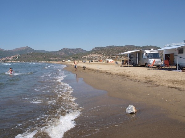 Unsere Fahrt führt uns eine wunderschöne Küstenstraße entlang zum wunderschönen kilometerlangen Sandstrand von Pamucak. Nachdem wir 5 TL gelöhnt haben suchen wir uns einen gut befestigten Platz keine 5 Meter vom Wasser entfernt und schlagen dort unsere Zelte für heute auf. Anschließend springen alle gleich ins kühle Meer und erfrischen sich – heute ist bisher der wärmste Tag unseres bisherigen Urlaubs. Abends dreht der Wind und kommt einem vor, wie ein warmer Föhn. Eine Abkühlung ist nur durch Baden im Meer möglich! Nach unserem gemeinsamen Abendessen wird der Wind immer stärker und entwickelt sich zu einem kleinen Sandsturm. Irgendwie haben wir in diesem Jahr kein Glück mit unseren freien Stellplätzen! Jedesmal Sturm! Ich setze mich vor lauter Frust an den Laptop und schreibe den Reisebericht der letzten Tage nach. Mich nervt das Wetter schon gewaltig!
