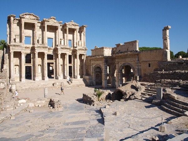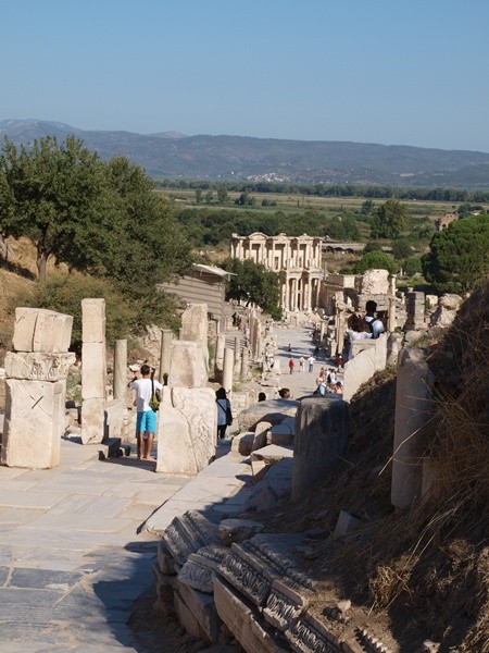 Nach einer unruhigen Nacht aufgrund des starken Windes stehen wir zeitig auf, damit wir früh in Ephesus sind. Vom Strand aus sind es noch rd. 10 km, die wir sehr schnell hinter uns bringen. Gefrühstückt wird während der Fahrt, aber auch nur Fertigkuchen. In Ephesus fahren wir auf den dortigen Parkplatz am unteren Eingang der Ausgrabungsstätten und löhnen 7,50 TL Parkgebühr – für ein Womo mit 7,20 m Länge genauso viel wie für ein Auto, da kann man nicht meckern. Weiter geht’s zum Eingang, dort sind pro Person noch mal 20 TL fällig – Yannick und Lena sind kostenlos. Also rein in die Anlage und schon stehen wir vor dem großen Amphitheater, das rd. 24.000 Personen gefasst hat. Weiter geht’s zur Celsus-Bibliothek, dem Hadrians-Tempel, über die Kuretenstraße an den Hanghäusern vorbei in Richtung oberer Eingang. Nachdem wir anfangs noch ziemlich alleine auf dem Gelände waren (wir sind schon aus diesem Grund früh los), füllen sich die Straßen allmäglich mit vielen Touristen, die aus den nahen Touri-Orten mit Bussen angekarrt werden. Chinesen, Italiener, Franzosen und und und, alle möglichen Nationen sind vertreten. Uns reicht es dann allmählich und so machen wir uns nach knapp 2 Stunden Besichtigung auf den Rückweg. Mittlerweile ist es auch schon fast unerträglich heiß.