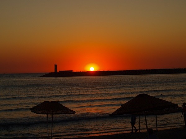 Der letzte Strandtag in Ören bricht an. Wie immer gehe ich mit Finn meine Morgenrunde und besorge an einem Mini-Bufe unser Frühstücksbrot. Zurück am Campingplatz werde ich schon von Ali erwartet, der auch gleich sein Futter bekommt. So langsam werden auch alle anderen wach und wir können frühstücken, heute nochmals mit Eier und Bacon. Zum Abschied. Der Tag wird wieder gleich langweilig, wir dösen in der Sonne und ich wasche nochmals Wäsche, da es hier heißes Wasser gibt. Abends gehen wir nochmals alle in die City. Als wir an unserer Lokanta ankommen, freuen sich die Besitzer, uns wiederzusehen. Für sie der beste Beweis, dass das Essen hervorragend ist. Wir essen nochmals Döner bzw. gefüllte Auberginen mit Hackfleisch. War total lecker. Zum Abschluss nochmals Leckereien bei der netten Dame und somit war dies unser letzter Abend in der Türkei. Wir fanden es super in der Türkei und wir sind uns alle 5 einig, dass wir wiederkommen werden, schließlich wollen wir wissen, ob es immer so windig in der Türkei ist.