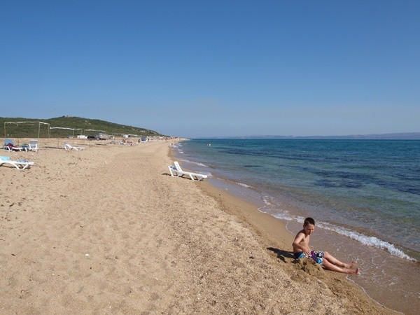 Wenig später entschließe ich mich kurzfristig nach rechts Richtung Mecidiye abzubiegen, da mir noch im Kopf war, dass dort ein schöner Strand sein soll. Kurz nach Ortsende folgen wir den Schildern zum „Uzunkum Plaji“ über eine staubige Steinpiste an Steinbrüchen vorbei. Am Strand angekommen, bezahlen wir pauschal 5 € für das Befahren des Geländes und können so lange bleiben, wie wir möchten. Hier gibt’s alles, was das Freisteherherz begehrt: Duschen, Toiletten, Wasser, Stellplätze direkt am Strand, herrlichen Sandstrand und sauberes Meer. Wir suchen uns daher ein geeignetes Plätzchen und ab geht’s ins Wasser. Hier herrscht allerdings ein ziemlich starker Wind, so dass wir uns später entschließen uns an eine andere Stelle des Strandes zu stellen. Dort angekommen geht bereits die Sonne unter und dann wird es schlagartig ziemlich kühl, was wir aus Griechenland für Mitte August so nicht kennen. Es wird also im Womo auf Abend gegessen, ich schreibe hier am Reisebericht und die Kinder lesen noch ein bisschen. Christine schaut noch kurz bei den Nachbarn im Womo vorbei und bleibt bei Wein bei den Weins hängen. Yannick verlässt das Womo heute natürlich lich nicht mehr, da ein örtlicher deutschsprechender Türke erzählt hatte, dass es hier freilaufende Wölfe gibt, die sich dann auch zu den Womos heranpirschen. Also nehmen wir den Rat an und lassen unseren Finn im Womo. Kurz darauf fallen wir alle ins Bett und schlafen erstmals in diesem Urlaub bei Meeresrauschen ein. Die Nacht war sehr windig, eigentlich schon orkanartig, und gegen morgens setzt auch noch starker Regen ein, der das Womo auch nicht sauber macht.