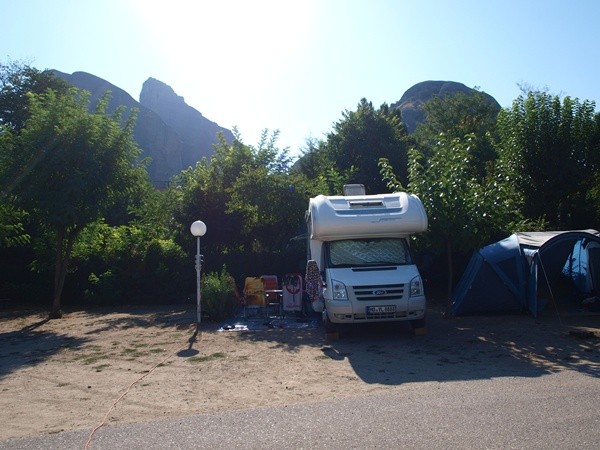 Gegen Abend und etlichen Serpentinen haben wir es geschafft und sind in Kastraki am Vrachos Camping angekommen und die Weins haben nicht zu viel versprochen, der Platz ist super schön, saubere Duschhäuser, WCs sauber und Pool mit Blick auf die Felsen. Was will man mehr? Da wir alle keine Lust mehr auf kochen haben, beschließen wir, am Campingplatz Essen zu gehen. Allerdings sind wir enttäuscht, erst die Preise nun in EURO und auch das Essen verspricht nicht das, was es halten sollte.