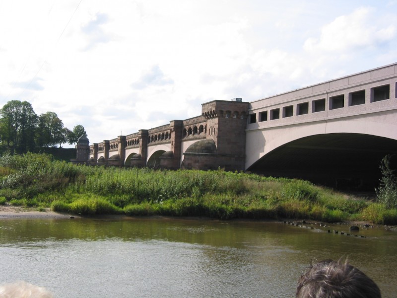 Vom Fluss Blick auf die Brücke, wo oben der Mittellandkanal drüber führt:
