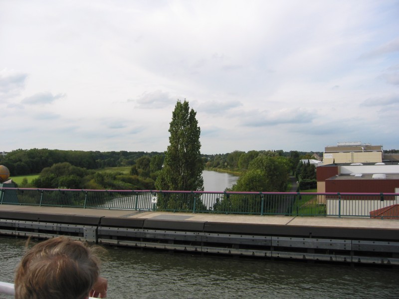 Nun schauen wir vom Kanal von der Brücke runter auf die Weser - 13 Meter Höhenunterschied überwindet die Schleuse: