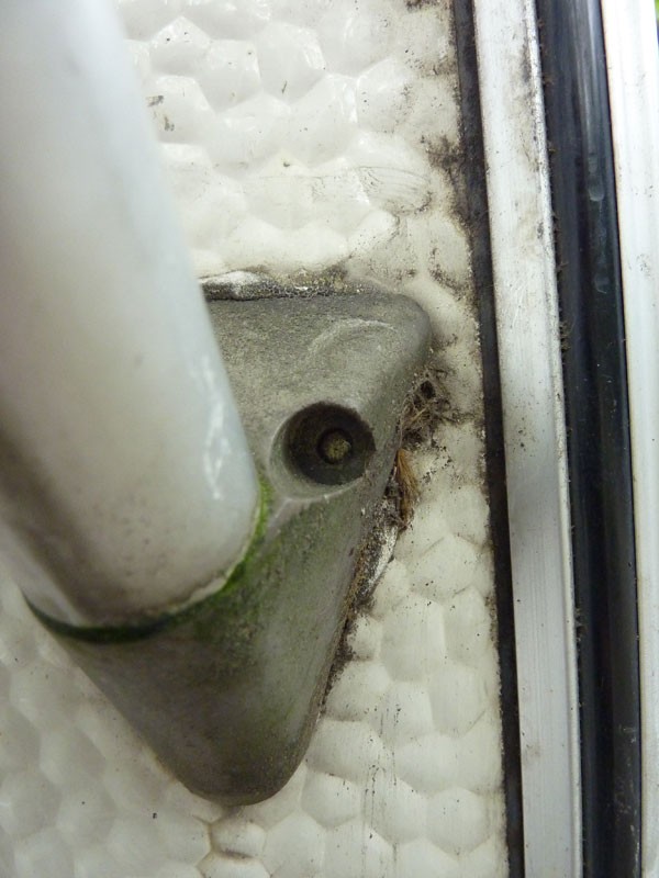 Innen kann ich nur eine Durchgangsscharube und eine Mutter sehen. Erreichen kann ich sie leider nicht, weil die Rohre des Kühlschrank-Kamins im Weg sind. So ein Mist. Der nächste Mensch, der mir ein gebrauchtes Wohnmobil verkauft, der wird sich wundern, wonach ich alles schauen und suchen werde. Mann Mann Mann.