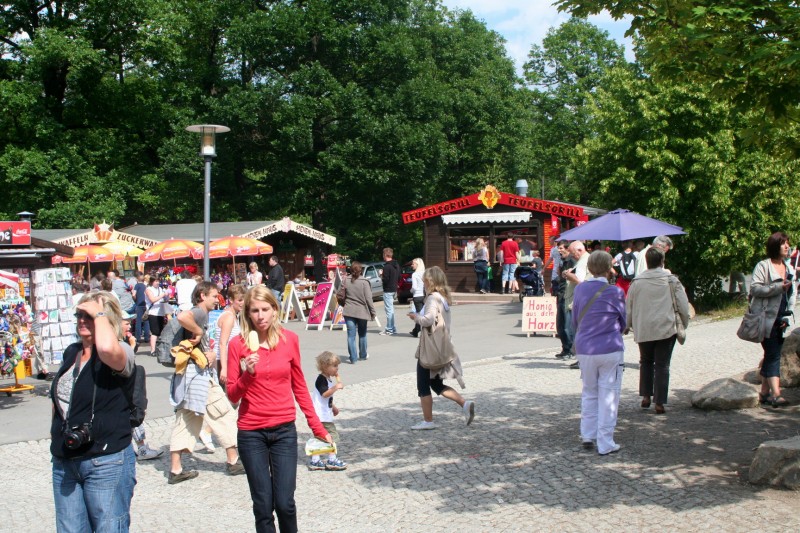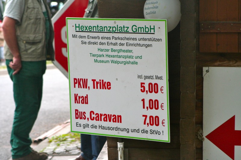 Am Nachmittag sind wir dann auf dem Hexentanzplatz bei Thale eingetroffen. Parkplätze waren Mangelware und die wenigen vorhandenen waren nicht gerade günstig. Auf dem offiziellen Parkplatz sollen Pkw 5 € und Caravan sogar 7 € kosten. Daher der Tipp: Nicht gerade aus der Ausschilderung folgen sondern zuvor links abbiegen und einen Parkplatz in den Seitenstraßen suchen. Wir standen kostenfrei in der Nähe und mussten lediglich wenige Minuten zu Fuss gehen.