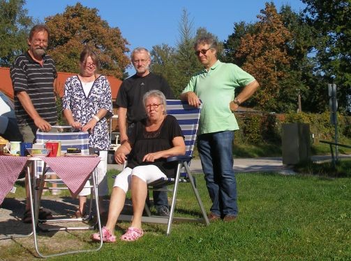 Und ein Forumsmitglied haben wir ebenfalls getroffen 8) karle2104 Jürgen aus München, ganz rechts (im Bild :wink: ) Gegen Mittag sind wir dann gen Heimat gestartet, in der Hoffnung am Brombachsee einen Platz zu kriegen. Dem war aber nicht so. Auch Altmühlsee und Rothenburg ob der Tauber waren hoffnungslos überbelegt. Jetzt stehen wir wunderbar in Simmershofen-Walkersdorf, einem sehr schönen Platz mitten in den Feldern des Frankenlandes --> Link und haben mit unsren Zeltnachbarn einen netten Abend verbracht. Schöner Sonnenaufgang! Das Gruppenbild mit blauem Himmel und Du als Mittelpunkt :daumen2: Der Mittelpunkt hat den Selbstauslöser betätigt, und die Stehplätze waren alle schon vergeben :D : :D