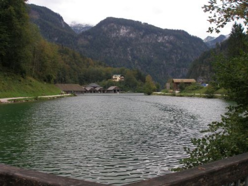 Stattdessen mache ich mit Bruno eine Wanderung zum gestern vom Boot aus gesehenen Aussichtspunkt Malerwinkel am Knick des Königssees (der helle Fleck links von der Bildmitte).