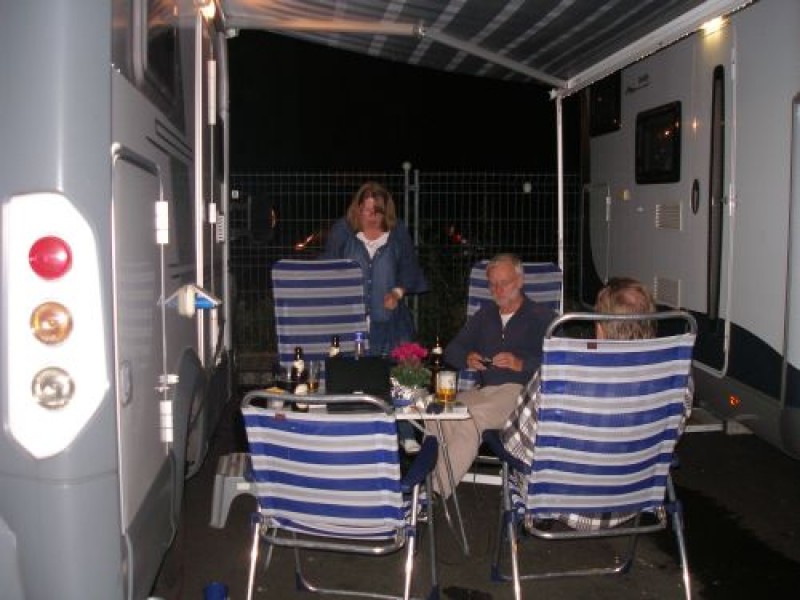 Bis kurz vor Mitternacht sitzen wir noch zwischen den Womos, machens Fäßchen leer, trotzen unter der Markise dem einsetzenden Regen, und dann wirds Zeit für die Heia.