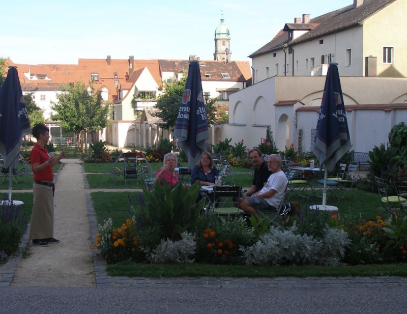 Zum Abendessen sitzen wir im sehr schön angelegten Park vor der Gaststätte Malteser.