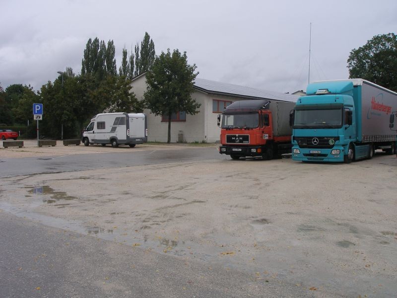 Ausgewiesene Stellplätze am Rand eines riesigen Festplatzes, auf dem auch LKWs parken. Ziemlich trostlos, aber für eine Übernachtung o.k.
