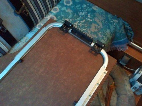 So sieht der Tisch von unten aus, der übrigens auch genauso im "teuren" Hymer und einigen anderen Premiummarken verdübelt ist. Man sieht schon, das die Verbindung Tisch/Rahmen mit ordentlichen Schrauben geschehen ist, wogegen die Schwachstelle eindeutig schon die beiden Kunststoffverbinder sind.