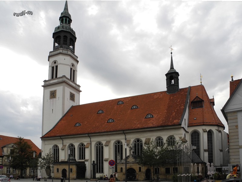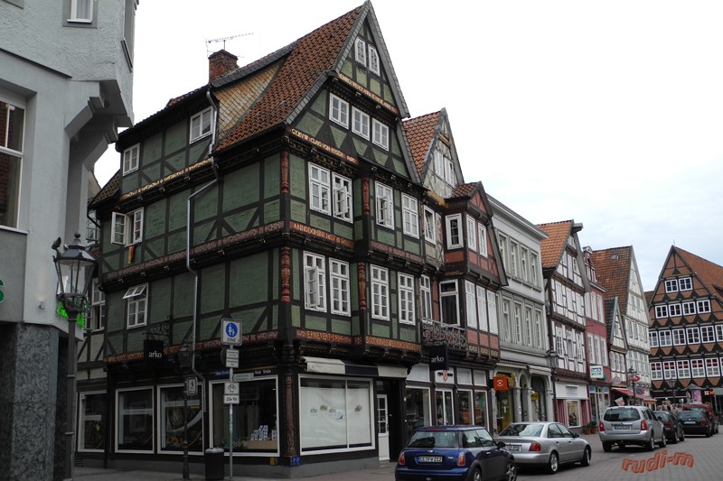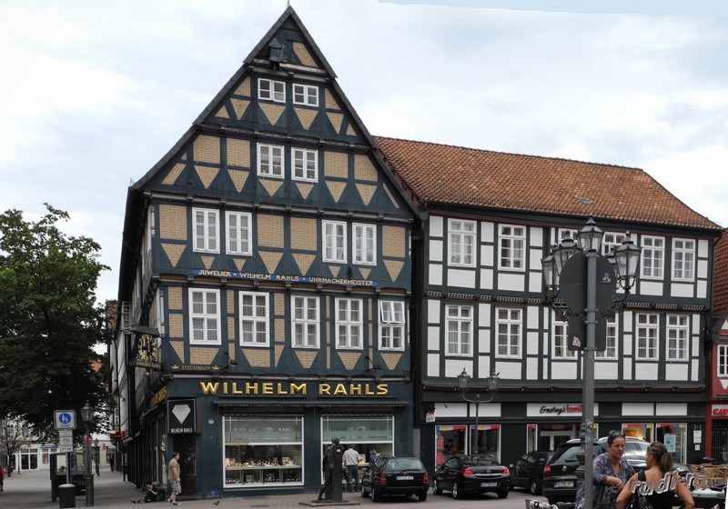 Bilder oben, schöne Fachwerkhäuser, unten die Stadtkirche von Celle.