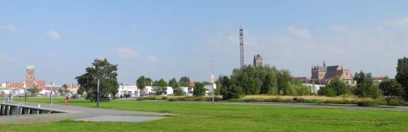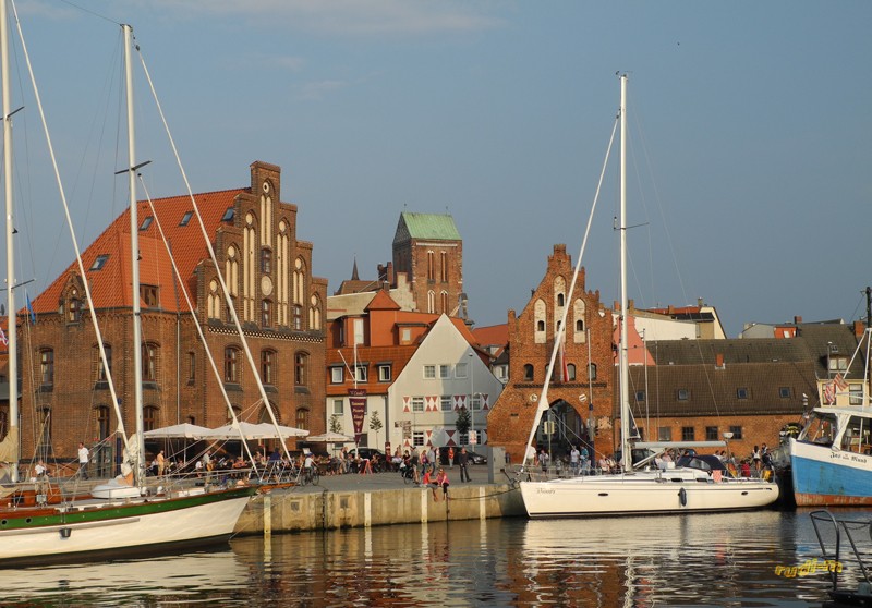 Ich möchte mit allzu vielen historischen Bildern den Bericht nicht überladen, es gäbe da noch einige. Am Heimweg hatten wir am Hafen in einem einfachen Fischrestaurant gegessen. Am Stellplatz sahen wir das Schild „geschlossen“ auf der Zufahrt stehen, der Platz war rappelvoll. Das folgende Panorama vom Hafen aus aufgenommen, zeigt von links nach rechts, die St. Nikolai, dann der Turm der ehemaligen St. Marien und fertig renovierte Außenhülle von der St. Georgen Kirche.