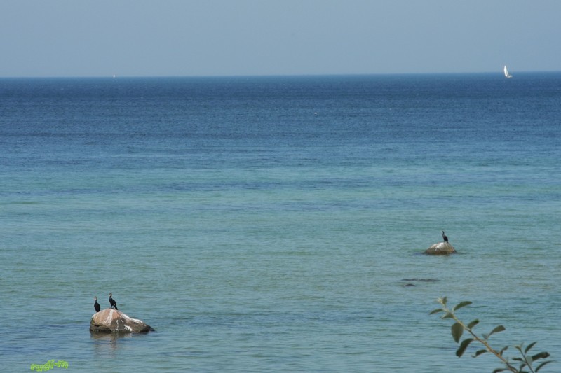Das obere Bild zeigt von Gollwitz aus, das NSG Langenwerder, am Unteren die Ostsee mit ausruhenden Kormoranen, bis die Futtersuche ansteht.