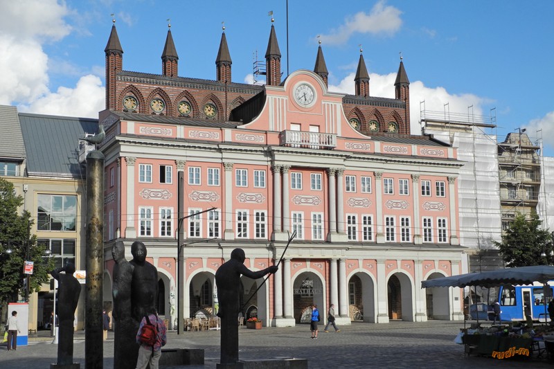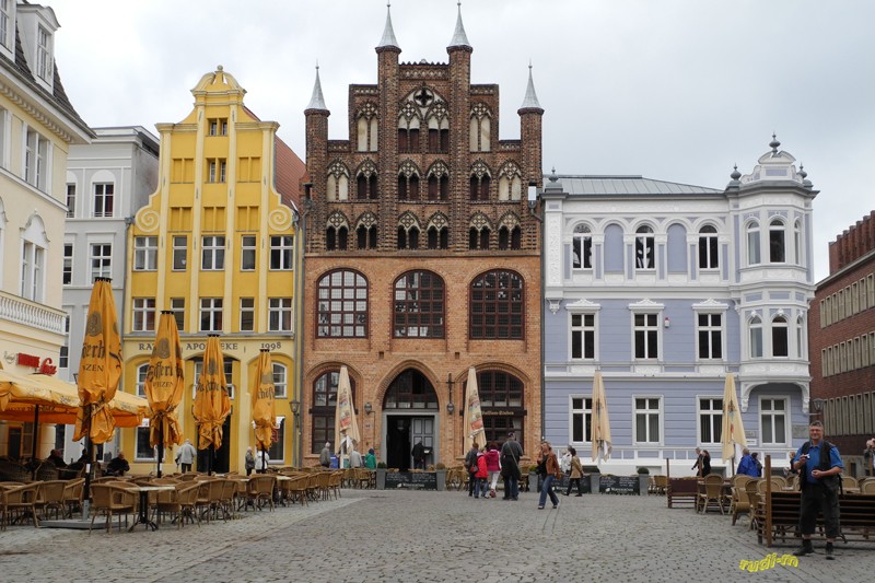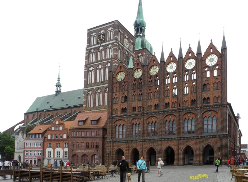 Mittwoch 31.08 Es wurde beschlossen weiter nach Stralsund zu fahren, und Rügen zu besuchen. Als nächster Stellplatz wurde, unmittelbar an der neuen Rügenbrücke, der Platz von Fa. Caravan - Dahnke angefahren. Nach einem ca. 20 Minuten Fußweg mit Regenschirm / Regenjacken waren wir in der Innenstadt. Am Marktplatz hat man den Blick auf die schönen Fassaden das Rathaus mit St. Nikolai.
