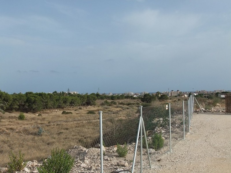 Blick nach Sueden, ueber das Waeldchen hinaus ein paar Daecher von Santa Pola, dannn das Meer.