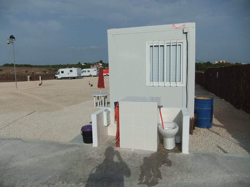 Grauwasser laeuft ueber die Bodenrinne, Schwarzwasser-Klos habe ich hier in Spanien das erste Mal gesehen. Frischwasser ist getrennt auf der linken Seite. Von der Rampe ein Blick ueber den Platz.