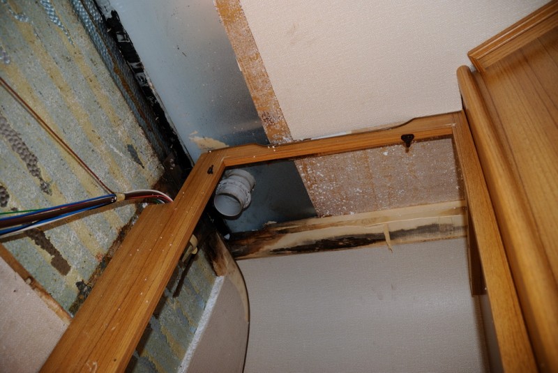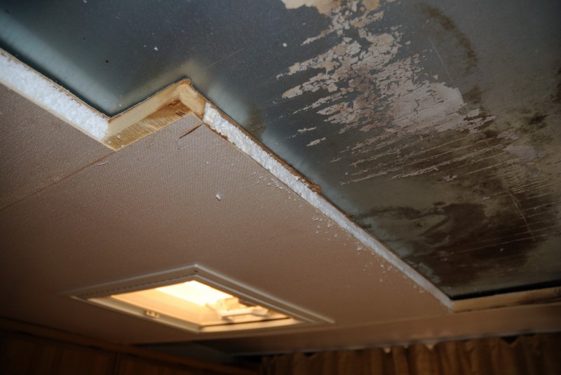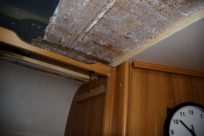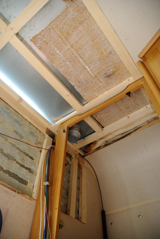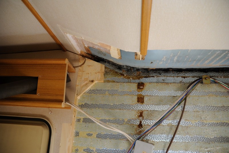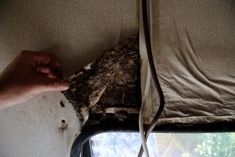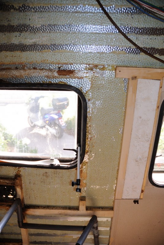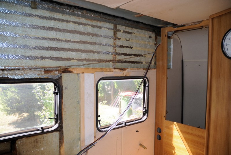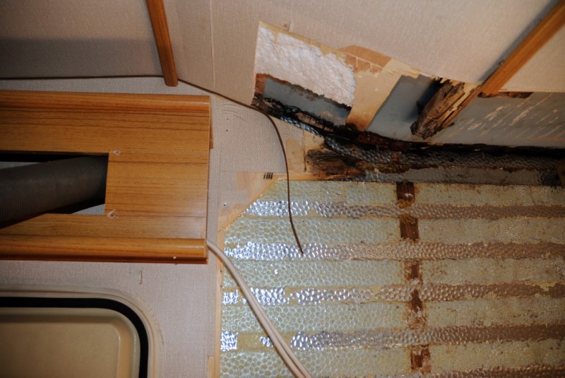 Als Schadensursache vermute ich ein eingedrücktes Dach im Bereich der Wohnraumtür; aussen ziemlich viel Dichtmasse, dazu war die Dachreling in dem Bereich verbogen - das läßt Rückschlüsse auf ein mechanische Überbeanspruchung der Dachkonstruktion zu.