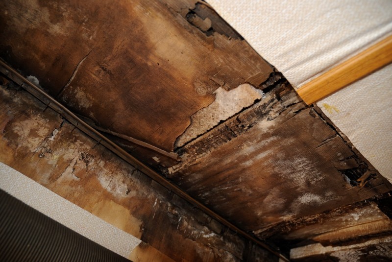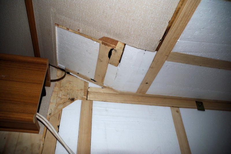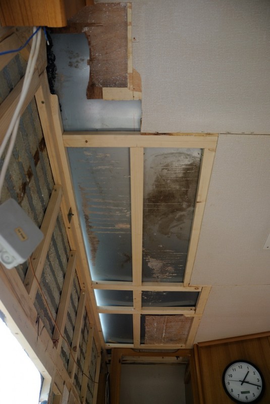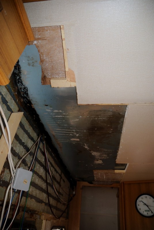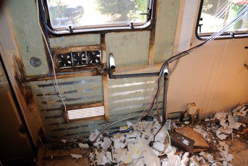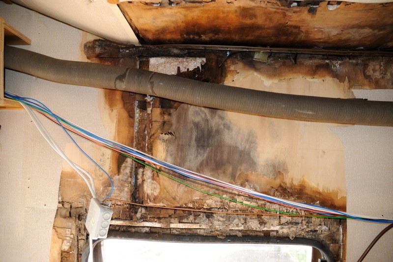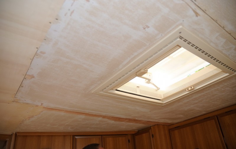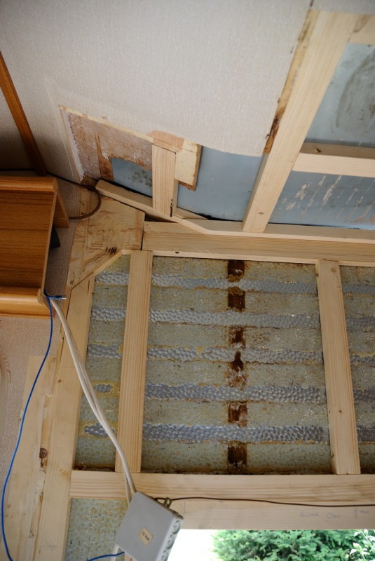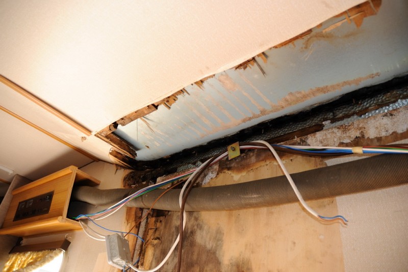 Als Schadensursache vermute ich ein eingedrücktes Dach im Bereich der Wohnraumtür; aussen ziemlich viel Dichtmasse, dazu war die Dachreling in dem Bereich verbogen - das läßt Rückschlüsse auf ein mechanische Überbeanspruchung der Dachkonstruktion zu.