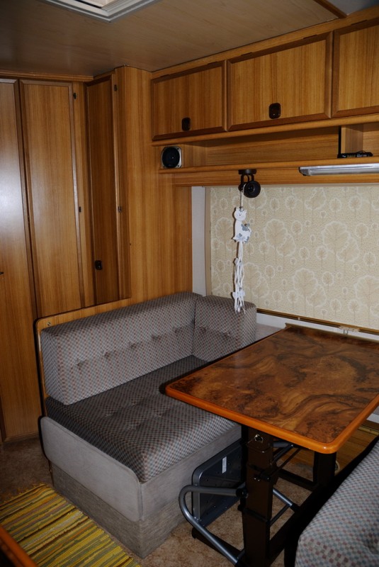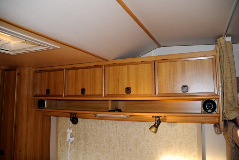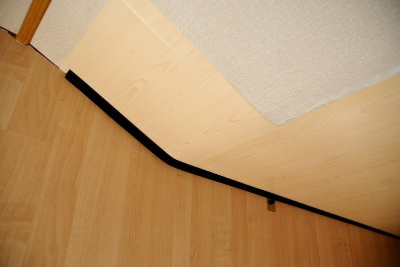 Das originale braune Kederband zwischen Wand und Decke habe ich durch eine schwarze L-Leiste aus Kunststoff (2x1cm) vom Baumarkt ersetzt, die läßt sich auch schön um die Alkovenkante biegen und mit kurzen Stiften leicht festnageln.