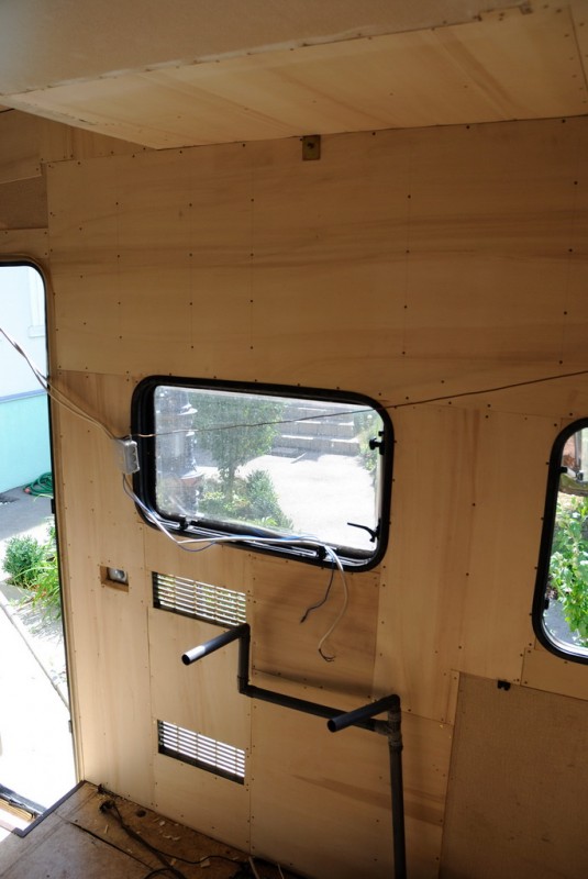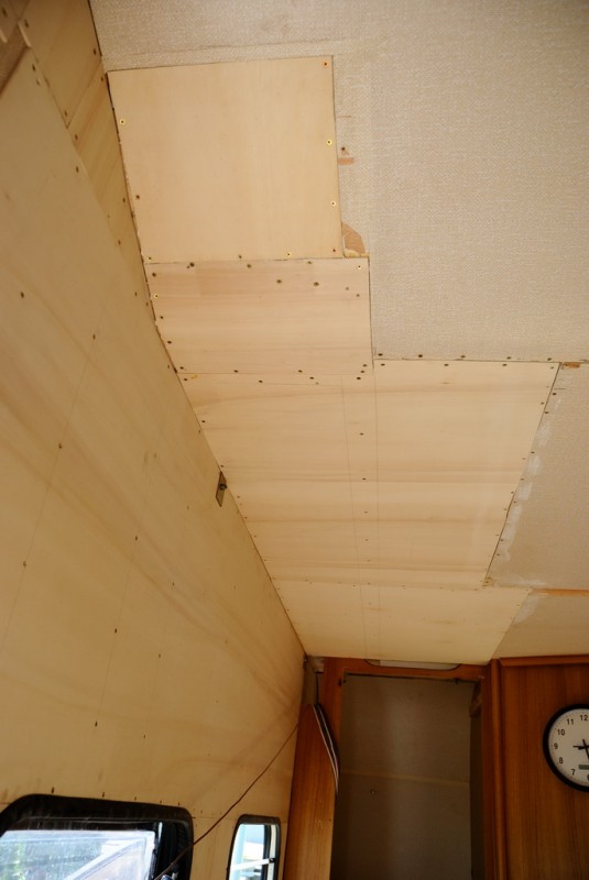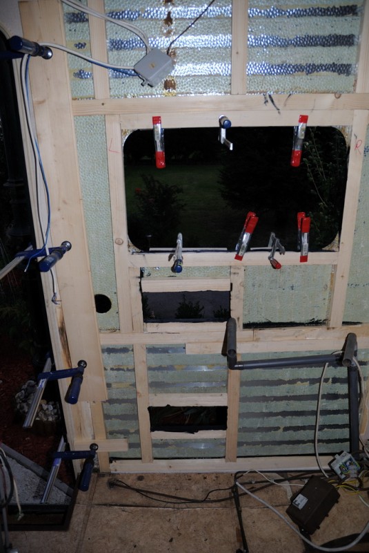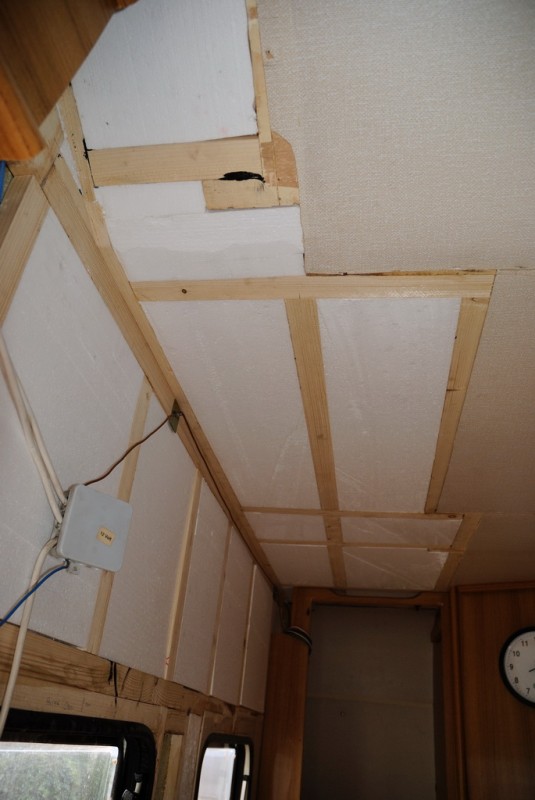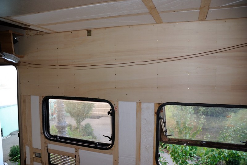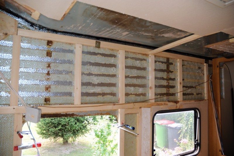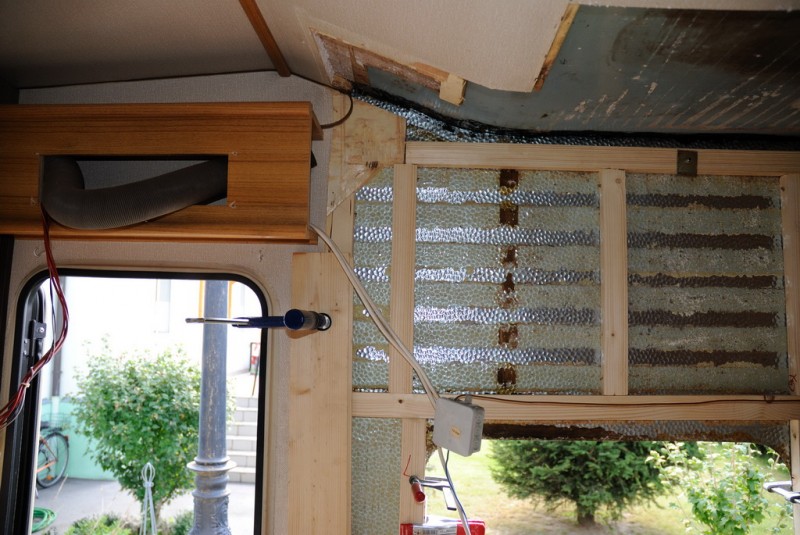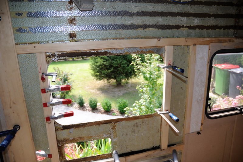 Die habe ich dann mit Sikaflex-Kleber 252 an die Alu-Aussenhaut geklebt und zusätzlich untereinander mit Holzleim verbunden. Das war, nachdem alles getrocknet war, schon ziemlich stabil.