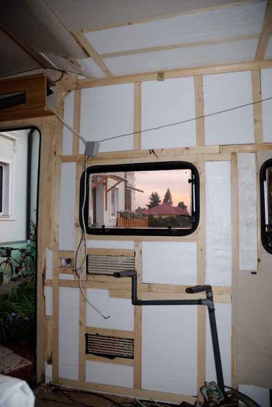 Nach der Dichtheitsprobe war die Dämmung dran; 3cm-Styroporplatten wurden mit einem Heissdrahtschneider in Form und Stärke gebracht und mit Sikaflex vollflächig verklebt: