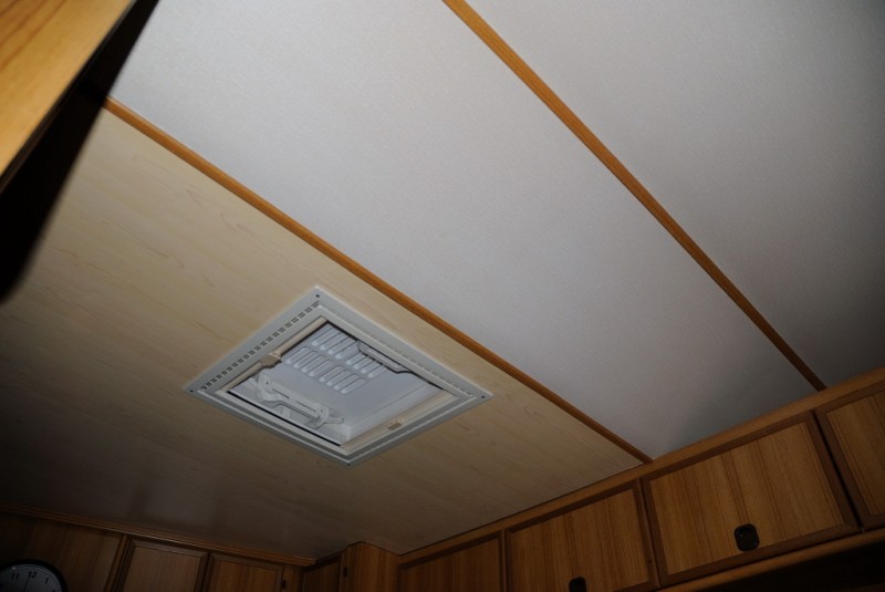 Man beachte die Wellen an der Decke nächst den Hängekästen und die Falten rund ums Fenster: