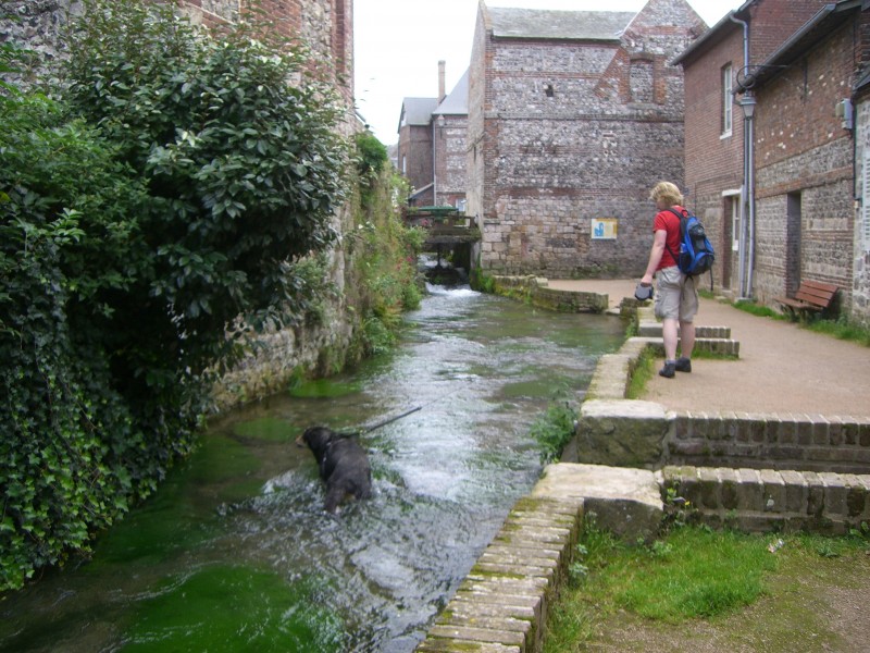 Mit schlechtem Gewissen fahren wir weiter. Le Treport ein toller Stellplatz am „funiculaire“. Wir fahren mit der Standseilbahn in den schönen kleinen Ort. Alles kostenfrei und mit Hund nutzbar. Leichter Nieselregen treibt uns weiter, wir schauen uns Dieppe an, Kira ist schon völlig genervt von dem vielen „Pflastertreten“. Wir fahren bis Veules-les-Roses, hier verläuft der kürzeste Fluss Frankreichs. Kira darf natürlich rein. Stellplatz direkt am Campingplatz in Laufnähe zu dem niedlichen Ort.