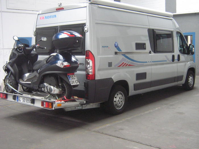 Wir "schleppen" unseren Roller auf der ausziebaren Stoßstange (verstärkt) mit. Es gibt hier aber auch Mitläufer, Anhänger etc. - hier im Forum schon genügend vorgestellt - für die 3,5t Klasse - wenns denn knapp wird mit der Zuladung.
