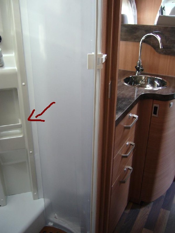Weiterhin hatte sich im Bad, dort wo man Duschgel etc. hinstellt, die Plastikquerverbindung gelöst. Es ist auch nur gedacht, dass das Shampoo usw. nicht herausfällt. Längere Touren mit viel gewackel und vollem Duschgel und Shampoo hielt sie dann nicht aus. Kein Problem sie wieder festzumachen und jetzt liegt das Duschgel während der Fahrt woanders.
