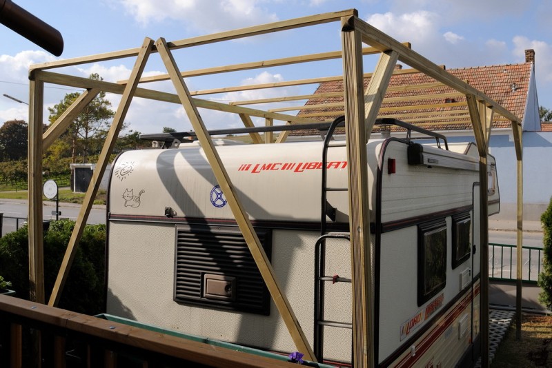 Steher blieben original (3,2m lang), die jeweils 2 Pfetten wurden überblattet (hoffe, das heisst wirklich so - Hälfte/Hälfte weggeschnitten, aufeinander gelegt und durchgeschraubt) und von oben in die Steher geschraubt (80/150er). Dann die Bänder angelegt und "von vorne" durchgeschraubt, die 9 Sparren oben quer aufgeteilt und festgeschraubt. Zuletzt (nur) hinten eine Diagonalverstrebung (2 Stk. 5,5,x4,5) eingesetzt. Auf Planenhöhe (bei mir 2,05m) herunten noch 5/8er Staffel rundherum für Planenbefestigung anbringen, fertig. (ev. noch die Kanten abschrägen damit die Plane nicht durchscheuert)