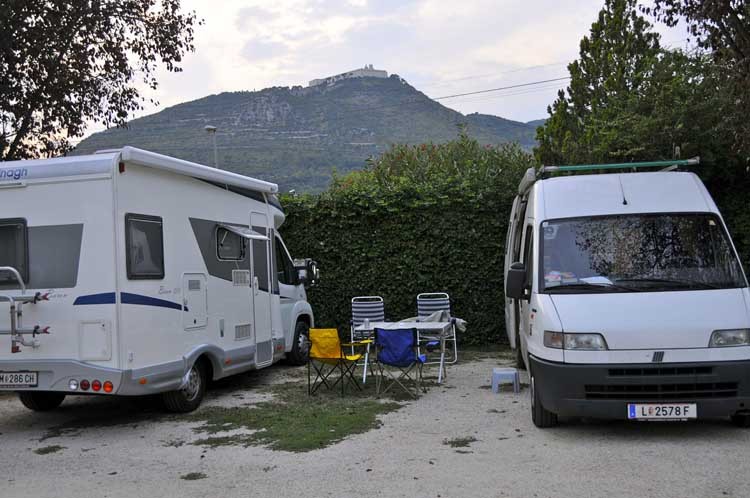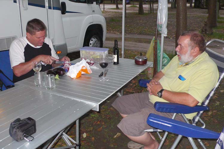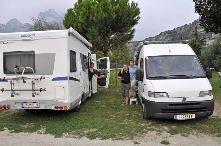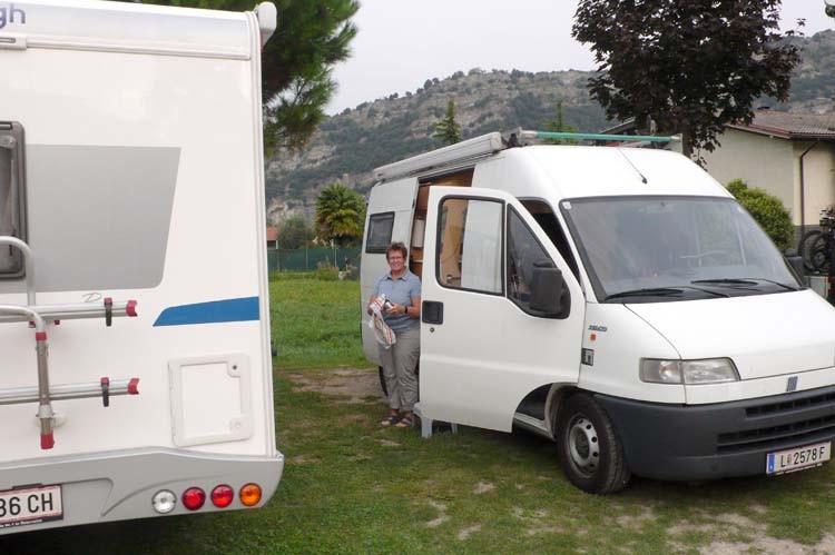 Um 14:15 sitzen wir in der Sattlerstr. in den Wohnmobilen. Ohne Stau (außer bei der Stadtausfahrt von Linz) kommen wir flott weiter. In der Nähe von Matrei tanken wir noch voll. Rasch haben wir den Brennerpaß hinter uns. In Bozen wird es langsam finster. Gegen 21:00 Uhr erreichen wir das heutige Ziel, einen Womostellplatz in Torbole am Nordufer des Gardasees, Maut € 12,-. Gerhard hat daheim Spagettisauce vorgekocht, schon bald nach der Ankunft sitzen wir bei einem dampfenden Teller Nudeln.