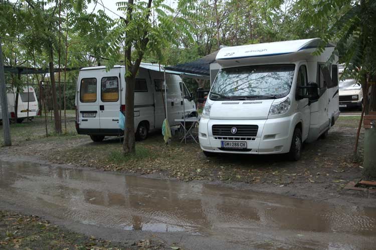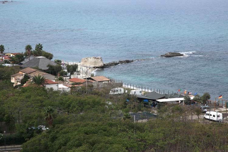 Nach dem Frühstück schon vor 9 Uhr fahren wir wieder weiter Richtung Süden. Bis Neapel schöne Autobahn und wenig Verkehr, € 8,- Maut. Danach mautfrei aber nach ca. 100 km ewig lange Baustellen, Gegenverkehr und 60 km Beschränkung. Wir müssen unser Tempo reduzieren, mehr als 110 km/h sind nicht drinnen. Nach ungefähr 400 km hat Gerhard die glorreiche Idee, heute nicht nach Sizilien zu fahren sondern in Tropea 2 Pausentage einzulegen. Nach kurzen Suchen finden wir den Campingplatz Marina del Convento (,N 38.40.560, E 15.53610) ganz in der Nähe vom Ortszentrum direkt am Meer. Kurz nach der Ankunft geht ein gewaltiges Gewitter nieder, aus dem Abflussrohr der Stadt kommt ein richtiger Wasserfall die Felswand herunter. Heute gibt es Penne mit Melanziani, viel Knoblauch, Zwiebel und Parmesan.