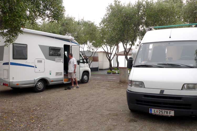 Nach einem Einkaufsstopp in einem schönen COOP Supermarkt geht die Reise weiter Richtung Süden. Auf der Autobahn kommen wir flott voran, kaum einmal wird der Verkehr zähflüssig, Stau haben wir gar keinen. Kurz nachdem wir Rom umfahren haben suchen wir einen beschriebenen SP, Maut € 38,50, der uns aber gar nicht gefällt. Wir drücken noch einmal 100km herunter und landen schließlich auf einem Camping- und Stellplatz in Monte Cassino, Maut € 5,20 .Die Anfahrt ist ein bißchen umständlich, aber trotzdem einfach zu finden. Wir zahlen € 13,- + €2,- für 2 Duschmarken. Tisch und Sessel können wir herausstellen, die Temperatur ist angenehm mild. Renate hat Knödel von daheim mit, die stehen heute auf dem Speiseplan: Speck-, Haschee- und Grammelknödel sind einfach herrlich. Gegen 23:00 Uhr fallen wir in die Betten.